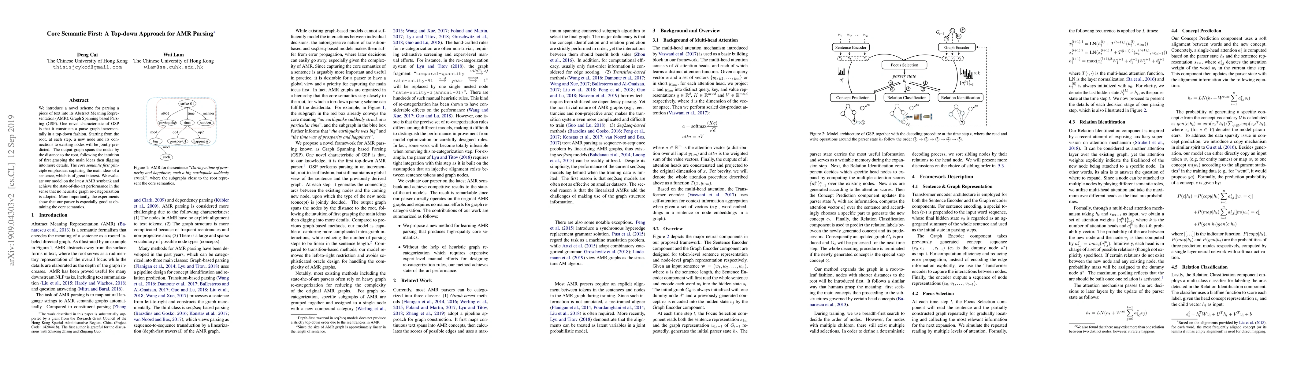 The paper introduces a top-down approach, Graph Spanning based Parsing (GSP), for parsing text into Abstract Meaning Representation (AMR) by incrementally building a parse graph starting from the root, focusing on capturing the main ideas first. The proposed method achieves state-of-the-art performance without heuristic graph re-categorization, especially excelling in extracting core semantics.
