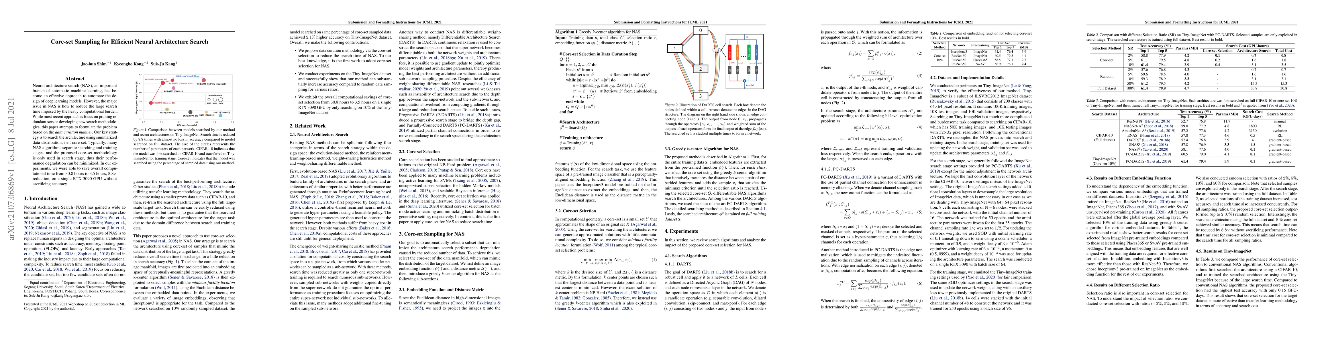 This paper proposes a new approach to neural architecture search that uses summarized data distribution, called core-set sampling, to reduce computational time by 8.8x without sacrificing accuracy.