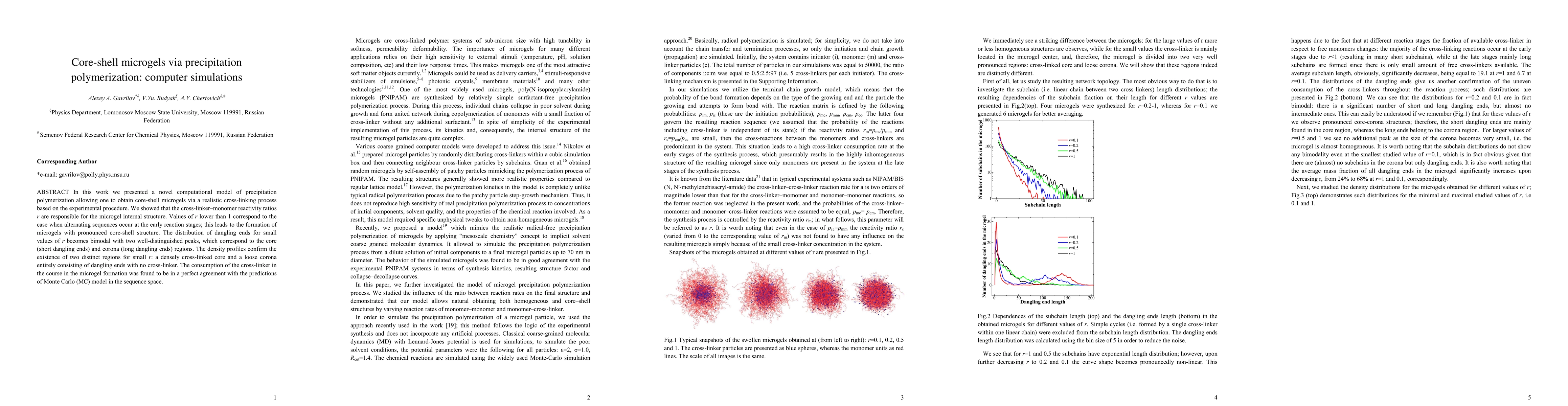 In this work we presented a novel computational model of precipitation polymerization allowing one to obtain core-shell microgels via a realistic cross-linking process based on the experimental procedure. We showed that the cross-linker-monomer reactivity ratios r are responsible for the microgel internal structure. Values of r lower than 1 correspond to the case when alternating sequences occur at the early reaction stages; this leads to the formation of microgels with pronounced core-shell structure. The distribution of dangling ends for small values of r becomes bimodal with two well-distinguished peaks, which correspond to the core (short dangling ends) and corona (long dangling ends) regions. The density profiles confirm the existence of two distinct regions for small r: a densely cross-linked core and a loose corona entirely consisting of dangling ends with no cross-linker. The consumption of the cross-linker in the course in the microgel formation was found to be in a perfect agreement with the predictions of Monte Carlo (MC) model in the sequence space.