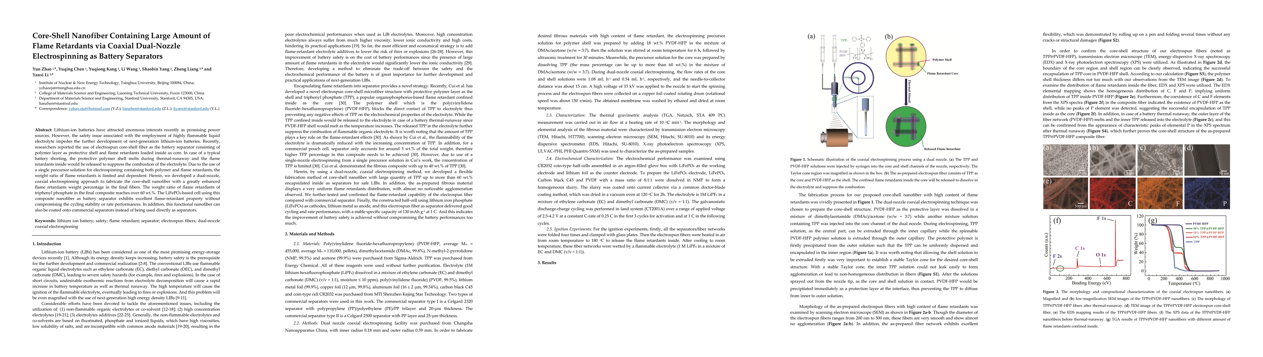 This paper presents a dual-nozzle, coaxial electrospinning technique to create core-shell nanofibers with a high concentration of flame retardants for lithium-ion battery separators, achieving over 60 wt.% triphenyl phosphate. These separators exhibit excellent flame-retardant properties without affecting cycling stability or rate performance.