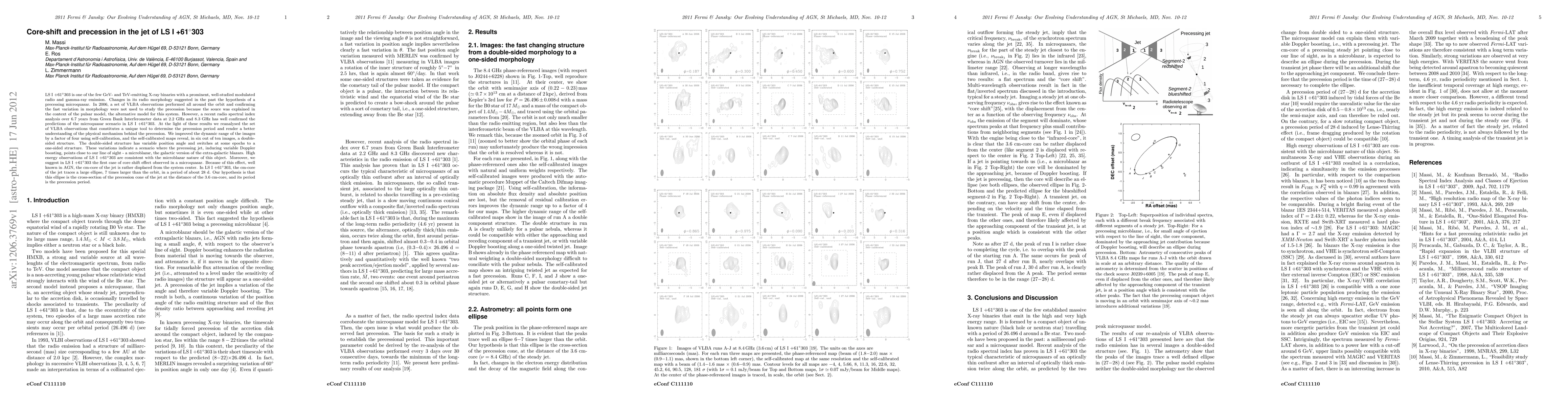 This paper investigates the jet of LSI+61303, a microquasar, revealing core-shift and precession phenomena through VLBA observations. The study finds a double-sided jet structure with variable position angles, supporting the microblazar model and identifying the first core-shift effect in a microquasar.