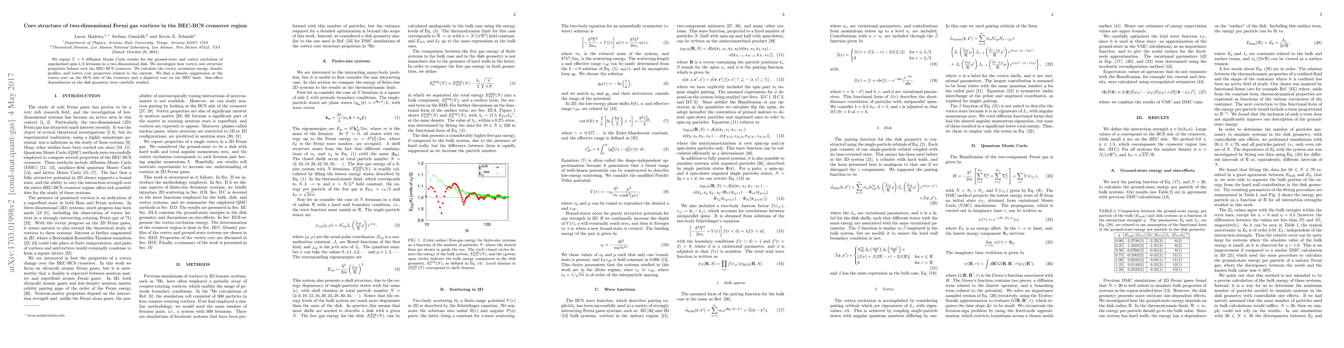 The research utilized $T=0$ diffusion Monte Carlo results to study the ground-state and vortex excitation of unpolarized spin-1/2 fermions in a two-dimensional disk, examining vortex core structure properties over the BEC-BCS crossover.