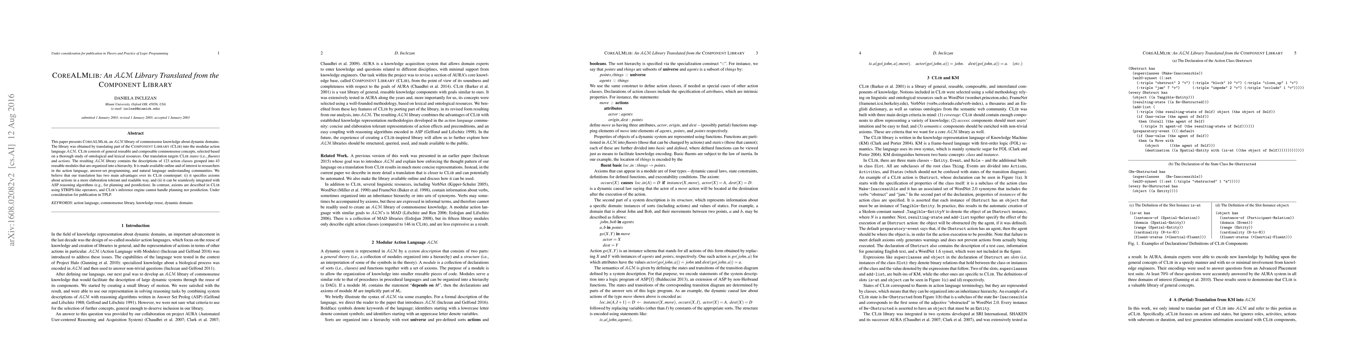 A new library called COREALMLIB has been created by translating a subset of the COMPONENT LIBRARY into Action Language (ALM), providing a commonsense knowledge base for dynamic domains, with improved readability and integration with Answer-Set Programming algorithms.