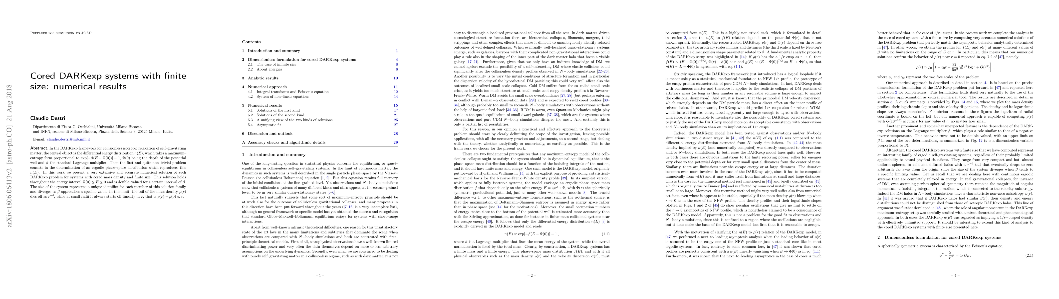 In the DARKexp framework for collisionless isotropic relaxation of self--gravitating matter, the central object is the differential energy distribution $n(E)$, which takes a maximum--entropy form proportional to $\exp[-\beta(E - \Phi(0))] - 1$, $\Phi(0)$ being the depth of the potential well and $\beta$ the standard Lagrange multiplier. Then the first and quite non--trivial problem consists in the determination of an ergodic phase--space distribution which reproduces this $n(E)$. In this work we present a very extensive and accurate numerical solution of such DARKexp problem for systems with cored mass density and finite size. This solution holds throughout the energy interval $\Phi(0)\le E\le 0$ and is double--valued for a certain interval of $\beta$. The size of the system represents a unique identifier for each member of this solution family and diverges as $\beta$ approaches a specific value. In this limit, the tail of the mass density $\rho(r)$ dies off as $r^{-4}$, while at small radii it always starts off linearly in $r$, that is $\rho(r)-\rho(0)\propto r$.