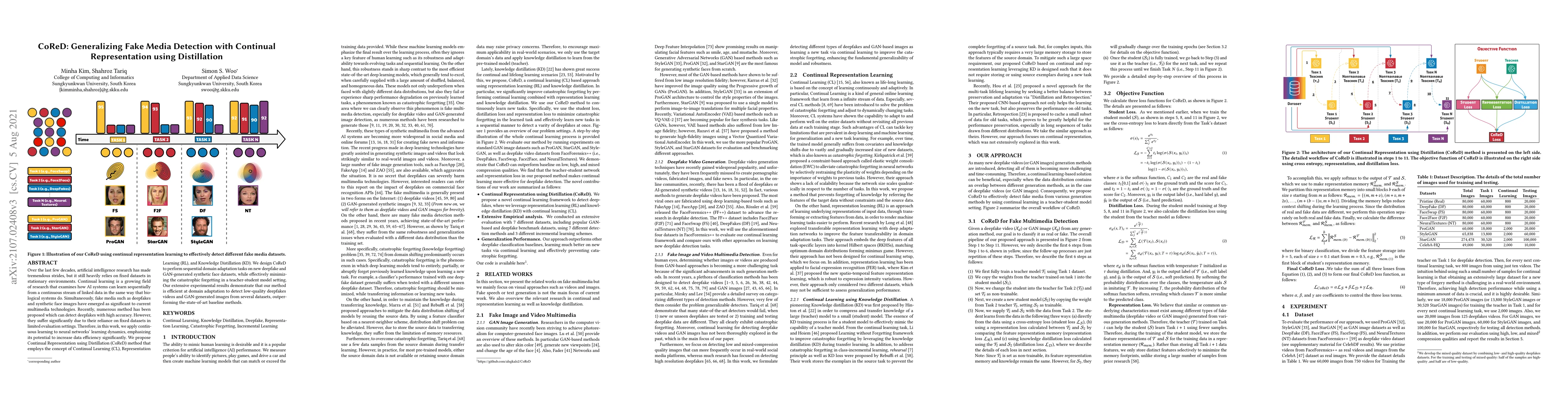 This paper proposes CoReD, a Continual Representation using Distillation method that integrates Continual Learning, Representation Learning, and Knowledge Distillation to enhance fake media detection. The method effectively minimizes catastrophic forgetting and achieves superior performance in detecting low-quality deepfakes and GAN-generated images across various datasets.