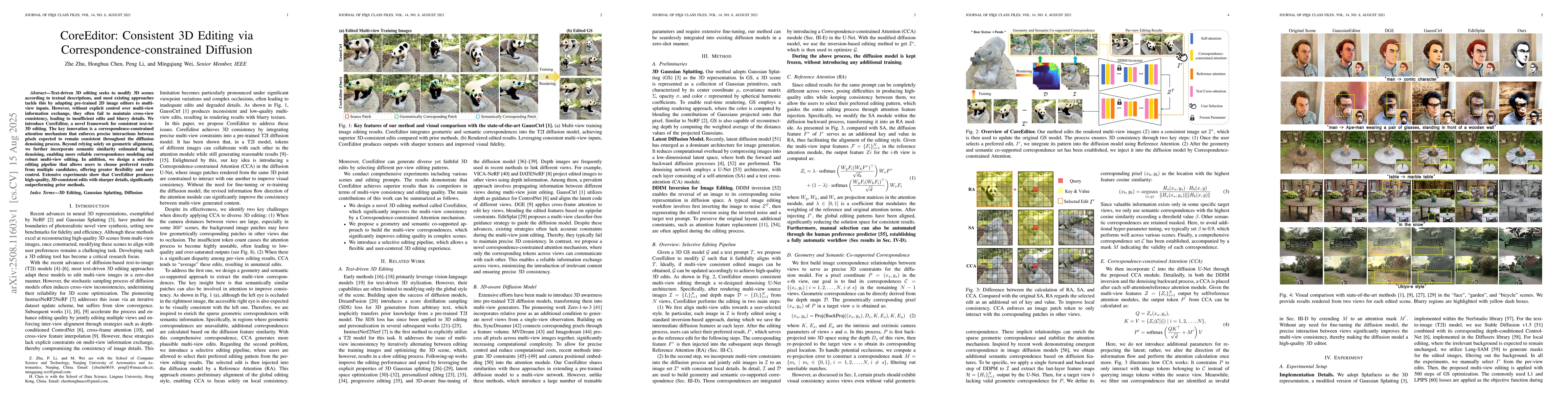 Text-driven 3D editing seeks to modify 3D scenes according to textual descriptions, and most existing approaches tackle this by adapting pre-trained 2D image editors to multi-view inputs. However, without explicit control over multi-view information exchange, they often fail to maintain cross-view consistency, leading to insufficient edits and blurry details. We introduce CoreEditor, a novel framework for consistent text-to-3D editing. The key innovation is a correspondence-constrained attention mechanism that enforces precise interactions between pixels expected to remain consistent throughout the diffusion denoising process. Beyond relying solely on geometric alignment, we further incorporate semantic similarity estimated during denoising, enabling more reliable correspondence modeling and robust multi-view editing. In addition, we design a selective editing pipeline that allows users to choose preferred results from multiple candidates, offering greater flexibility and user control. Extensive experiments show that CoreEditor produces high-quality, 3D-consistent edits with sharper details, significantly outperforming prior methods.