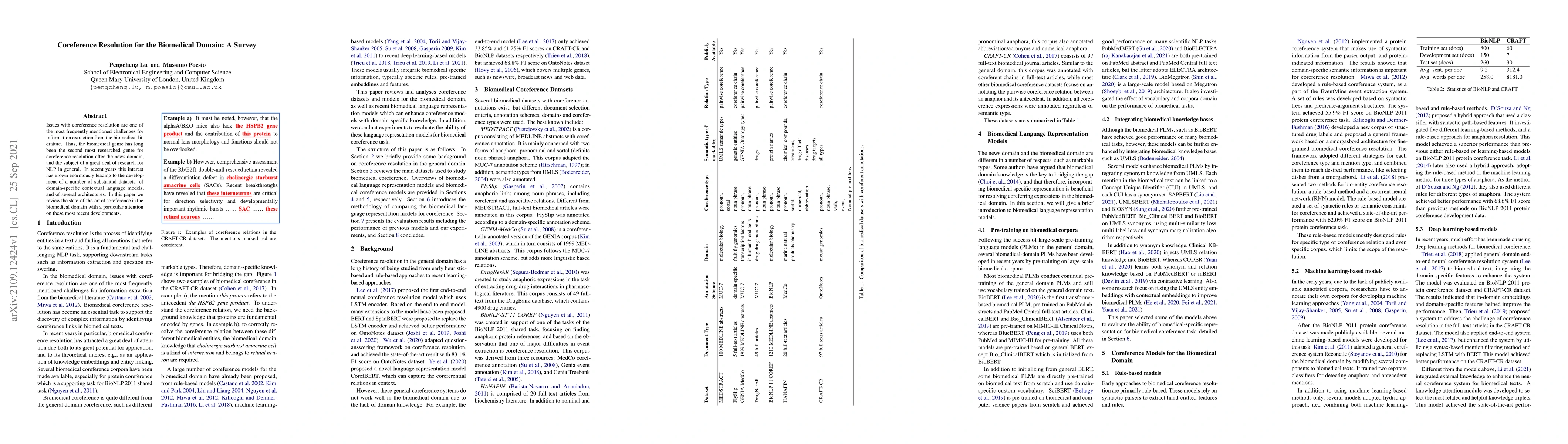 This paper surveys the advancements in coreference resolution techniques within the biomedical literature, highlighting recent developments in datasets, contextual language models, and novel architectures designed to tackle the unique challenges of this domain. It emphasizes the growing interest and significant progress in this area of natural language processing research.
