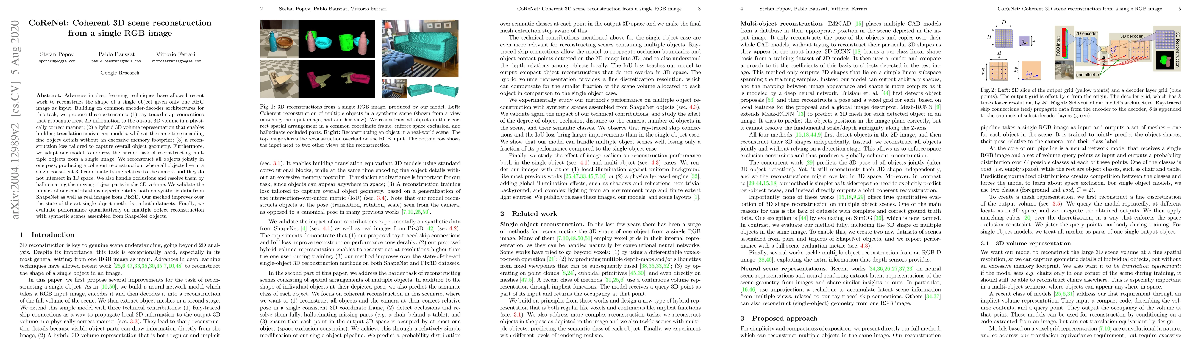CoReNet proposes a deep learning approach to reconstruct coherent 3D scenes from single RGB images, utilizing ray-traced skip connections, a hybrid 3D volume representation, and a tailored reconstruction loss to achieve accurate and memory-efficient results. The method also handles multiple objects by reconstructing them jointly in a consistent 3D coordinate frame.