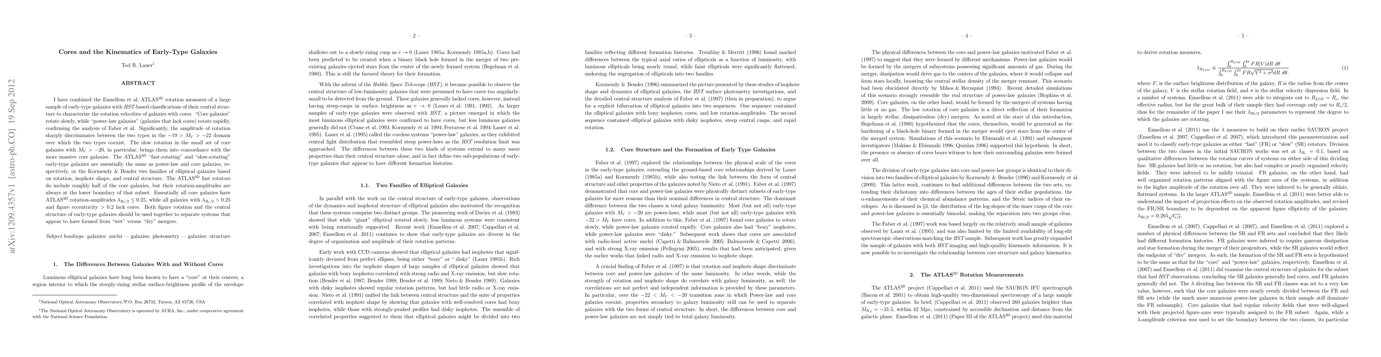 The paper presents a detailed kinematic analysis of early-type galaxies using combined ATLAS3D rotation measures and HST-based central structure classifications, providing a robust framework for distinguishing between core and power-law galaxies.