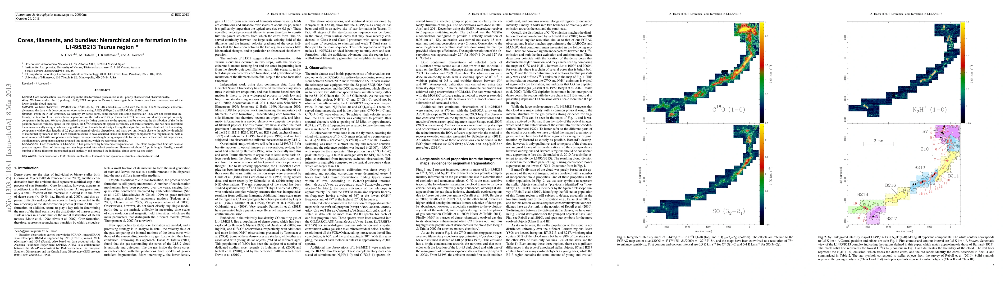 This study investigates the hierarchical core formation in the L1495/B213 Taurus region, identifying dense cores, filaments, and bundles through N$_2$H$^+$ and C$^{18}$O emissions. Core formation proceeds via fragmentation, with filaments forming first and then producing the dense cores observed today.