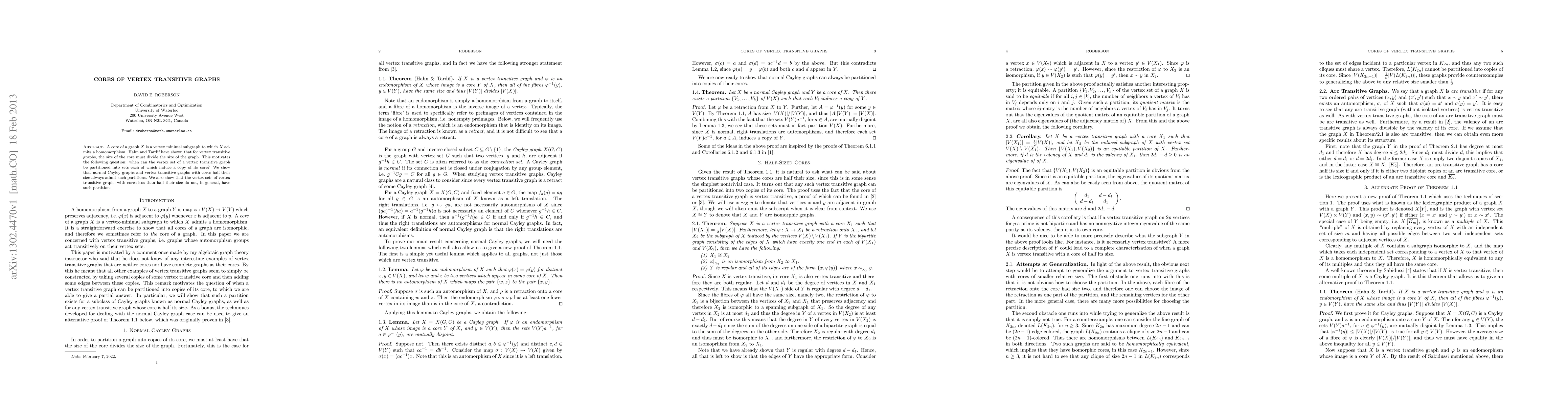 The paper analyzes vertex transitive graphs, focusing on their cores, using endomorphisms and retractions, with a particular emphasis on normal Cayley graphs and vertex transitive graphs with cores half their size.