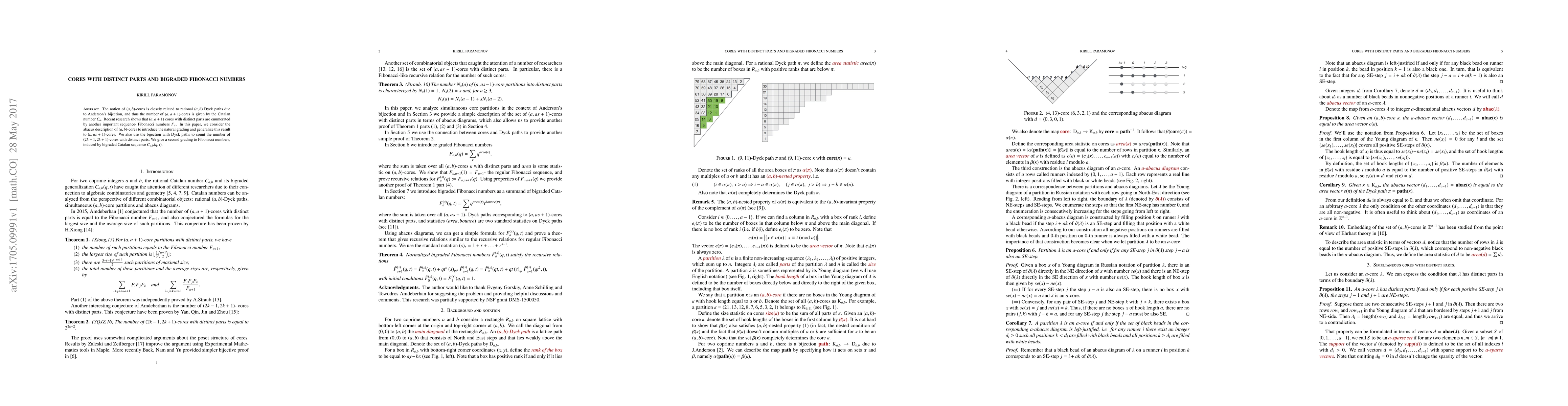 This paper investigates the enumeration of $(a,b)$-cores with distinct parts using Fibonacci numbers, generalizing a previous result to $(a,as+1)$-cores. It also introduces a new grading by bigraded Catalan sequence $C_{a,b} (q,t)$.