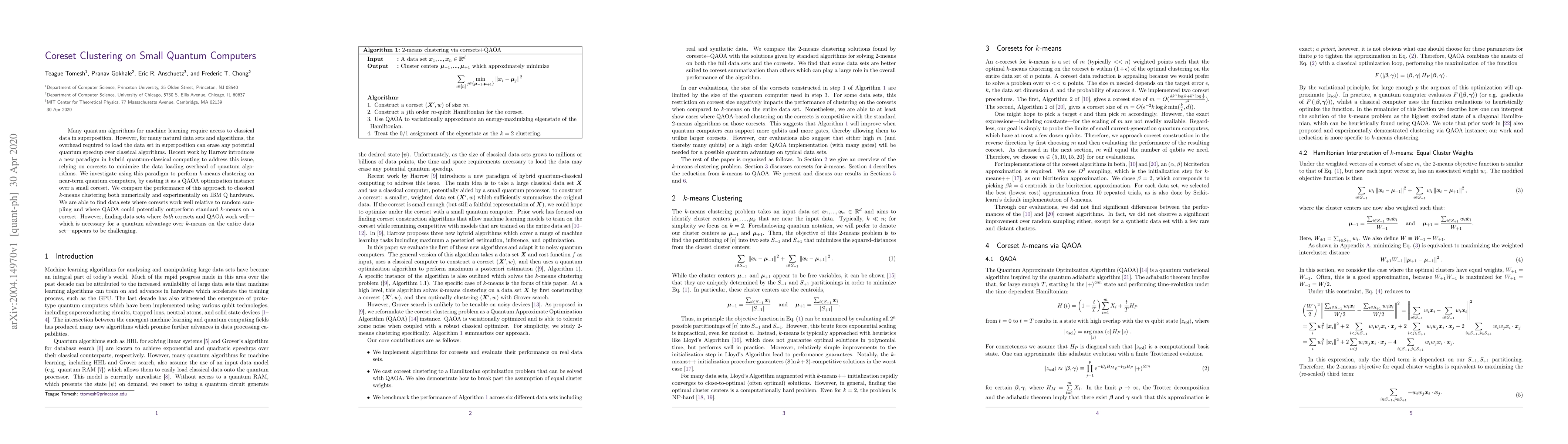 The paper investigates coreset clustering for $k$-means on near-term quantum computers, comparing it to classical $k$-means and implementing it via QAOA optimization over a small coreset. Experiments were conducted on IBM Q hardware.
