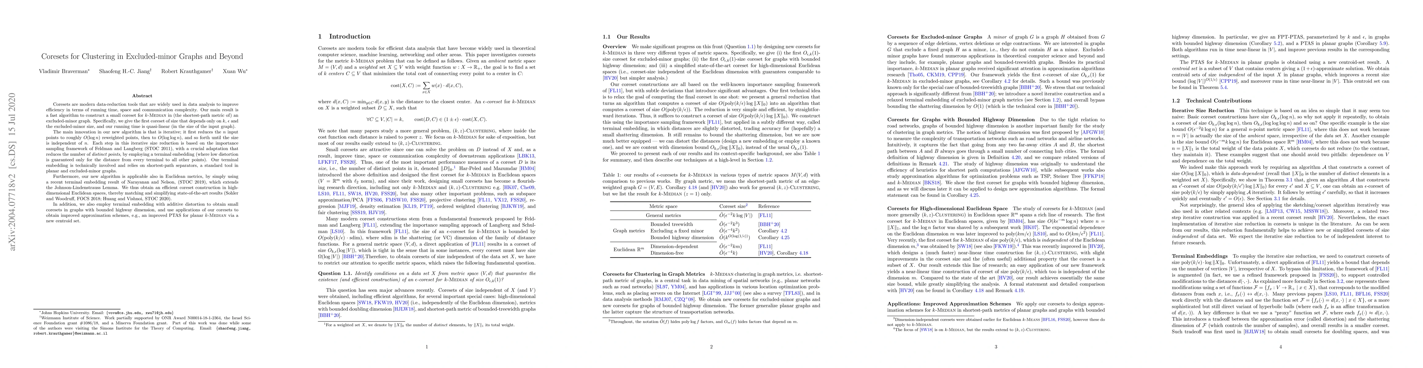 Coresets are modern data-reduction tools that are widely used in data analysis to improve efficiency in terms of running time, space and communication complexity. Our main result is a fast algorithm to construct a small coreset for k-Median in (the shortest-path metric of) an excluded-minor graph. Specifically, we give the first coreset of size that depends only on $k$, $\epsilon$ and the excluded-minor size, and our running time is quasi-linear (in the size of the input graph). The main innovation in our new algorithm is that is iterative; it first reduces the $n$ input points to roughly $O(\log n)$ reweighted points, then to $O(\log\log n)$, and so forth until the size is independent of $n$. Each step in this iterative size reduction is based on the importance sampling framework of Feldman and Langberg (STOC 2011), with a crucial adaptation that reduces the number of \emph{distinct points}, by employing a terminal embedding (where low distortion is guaranteed only for the distance from every terminal to all other points). Our terminal embedding is technically involved and relies on shortest-path separators, a standard tool in planar and excluded-minor graphs. Furthermore, our new algorithm is applicable also in Euclidean metrics, by simply using a recent terminal embedding result of Narayanan and Nelson, (STOC 2019), which extends the Johnson-Lindenstrauss Lemma. We thus obtain an efficient coreset construction in high-dimensional Euclidean spaces, thereby matching and simplifying state-of-the-art results (Sohler and Woodruff, FOCS 2018; Huang and Vishnoi, STOC 2020). In addition, we also employ terminal embedding with additive distortion to obtain small coresets in graphs with bounded highway dimension, and use applications of our coresets to obtain improved approximation schemes, e.g., an improved PTAS for planar k-Median via a new centroid set.