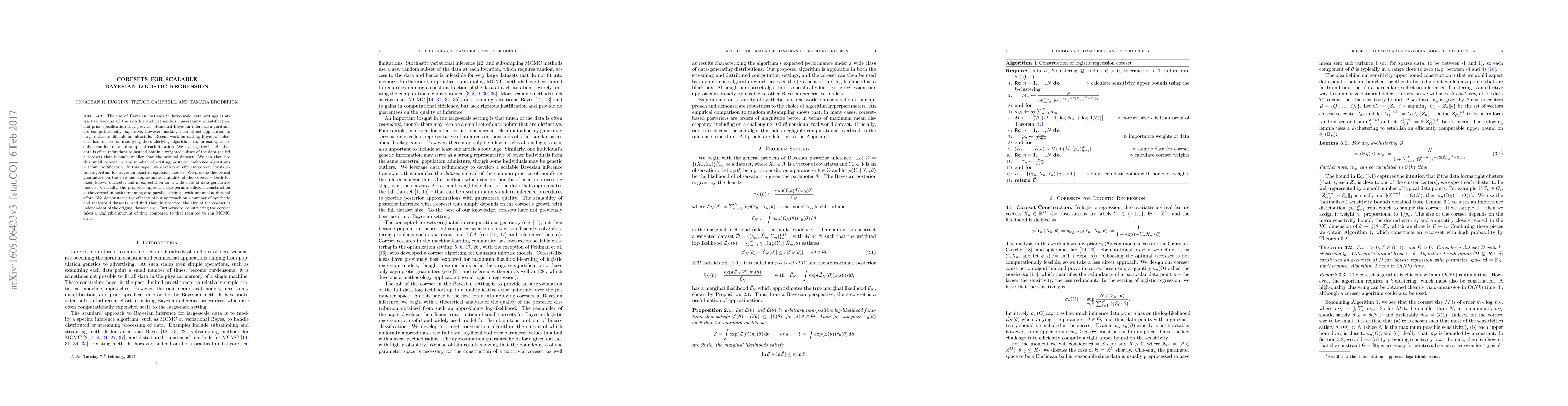 Researchers developed an efficient method to create a small subset of data (coreset) that allows for scalable Bayesian logistic regression analysis, enabling fast and accurate predictions on large datasets.