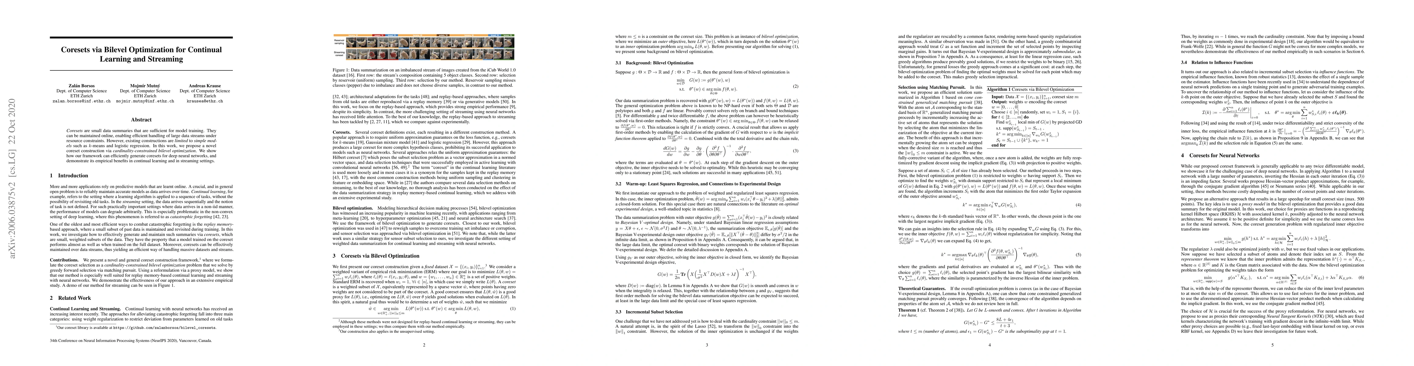 This paper proposes a novel coreset construction method using cardinality-constrained bilevel optimization for efficient continual learning and streaming. The framework can generate coresets for deep neural networks, demonstrating empirical benefits in these settings.