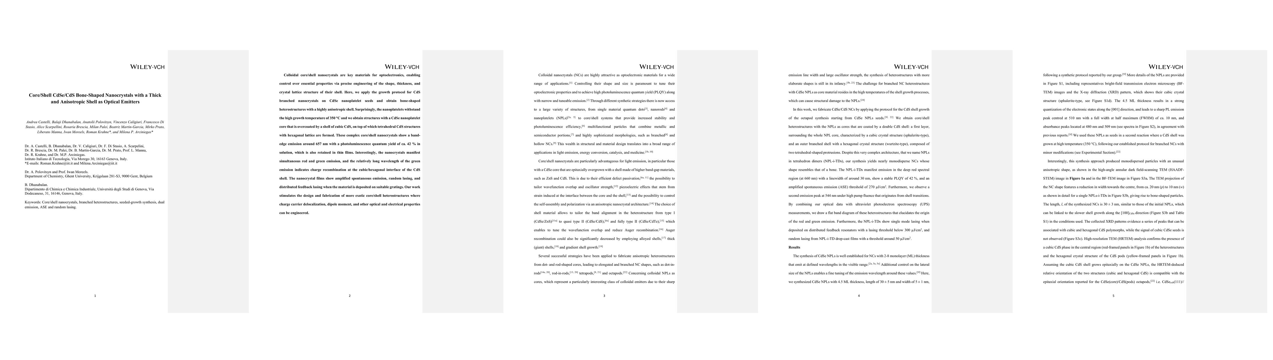This paper reports the synthesis of bone-shaped CdSe/CdS nanocrystals with a thick and anisotropic CdS shell, demonstrating their potential as optical emitters. The nanocrystals exhibit simultaneous red and green emission, with the green emission attributed to charge recombination at the cubic/hexagonal CdS interface, and show amplified spontaneous emission and lasing properties when deposited on gratings.