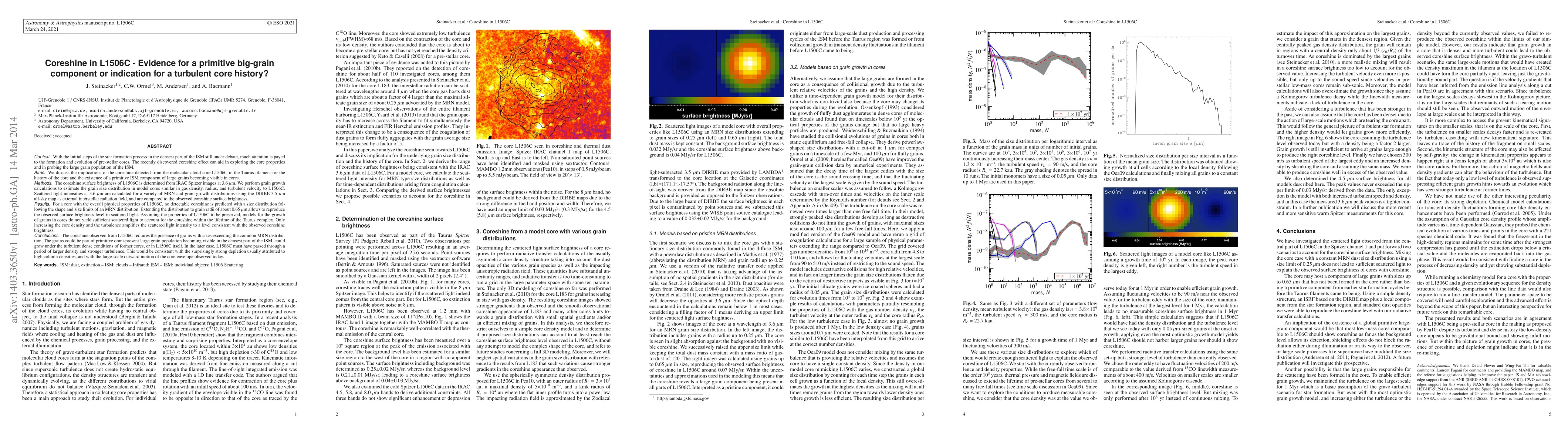 The recently discovered coreshine effect can aid in exploring the core properties and in probing the large grain population of the ISM. We discuss the implications of the coreshine detected from the molecular cloud core L1506C in the Taurus filament for the history of the core and the existence of a primitive ISM component of large grains becoming visible in cores. The coreshine surface brightness of L1506C is determined from IRAC Spitzer images at 3.6 micron. We perform grain growth calculations to estimate the grain size distribution in model cores similar in gas density, radius, and turbulent velocity to L1506C. Scattered light intensities at 3.6 micron are calculated for a variety of MRN and grain growth distributions to compare with the observed coreshine. For a core with the overall physical properties of L1506C, no detectable coreshine is predicted for an MRN size distribution. Extending the distribution to grain radii of about 0.65 $\mu$m allows to reproduce the observed surface brightness level in scattered light. Assuming the properties of L1506C to be preserved, models for the growth of grains in cores do not yield sufficient scattered light to account for the coreshine within the lifetime of the Taurus complex. Only increasing the core density and the turbulence amplifies the scattered light intensity to a level consistent with the observed coreshine brightness. The grains could be part of primitive omni-present large grain population becoming visible in the densest part of the ISM, could grow under the turbulent dense conditions of former cores, or in L1506C itself. In the later case, L1506C must have passed through a period of larger density and stronger turbulence. This would be consistent with the surprisingly strong depletion usually attributed to high column densities, and with the large-scale outward motion of the core envelope observed today.