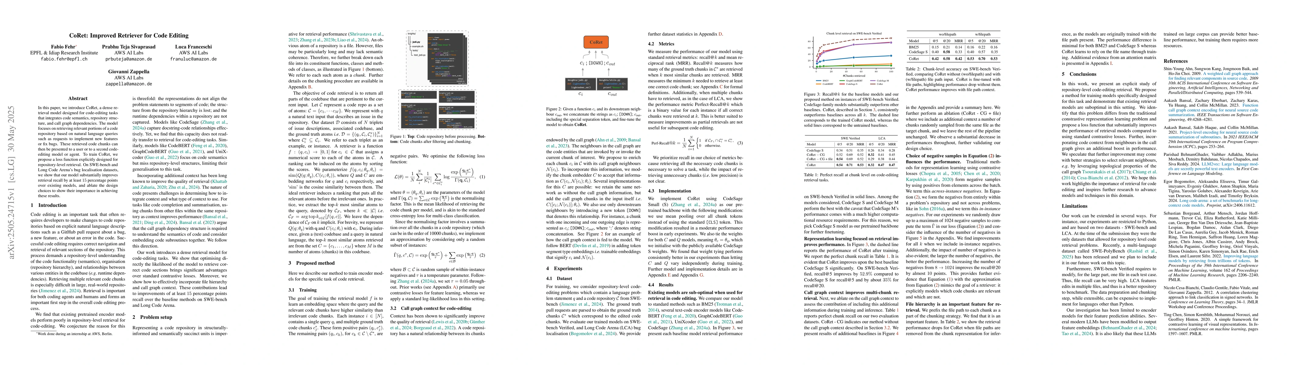 CoRet introduces an improved dense retrieval model for code editing tasks, incorporating code semantics, repository structure, and call graph dependencies, along with a novel repository-level loss function for training.