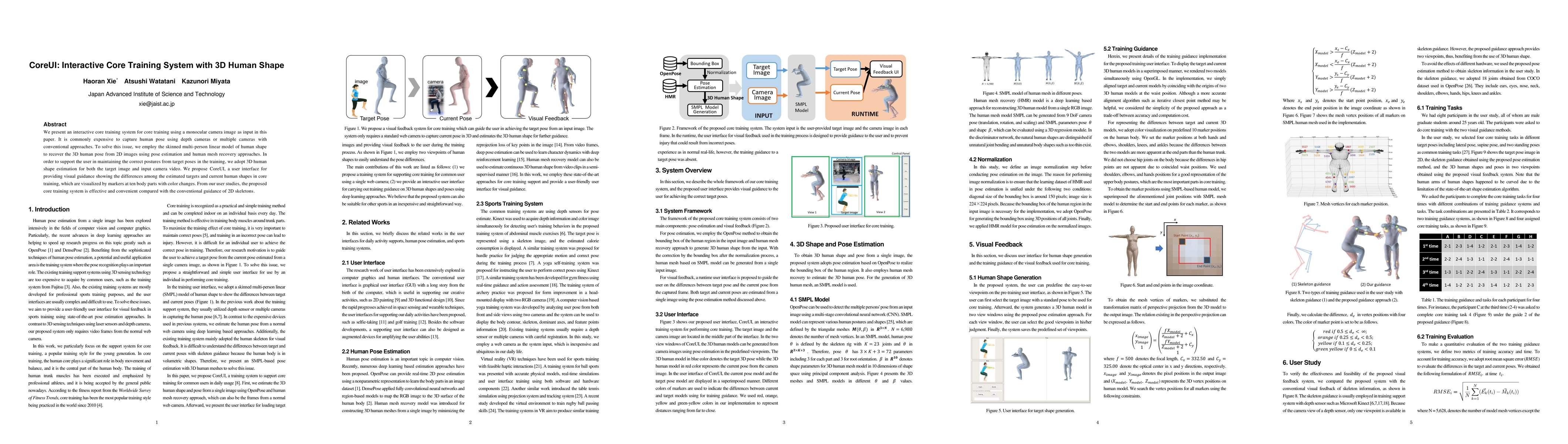 We present an interactive core training system for core training using a monocular camera image as input in this paper. It is commonly expensive to capture human pose using depth cameras or multiple cameras with conventional approaches. To solve this issue, we employ the skinned multi-person linear model of human shape to recover the 3D human pose from 2D images using pose estimation and human mesh recovery approaches. In order to support the user in maintaining the correct postures from target poses in the training, we adopt 3D human shape estimation for both the target image and input camera video. We propose CoreUI, a user interface for providing visual guidance showing the differences among the estimated targets and current human shapes in core training, which are visualized by markers at ten body parts with color changes. From our user studies, the proposed core training system is effective and convenient compared with the conventional guidance of 2D skeletons.