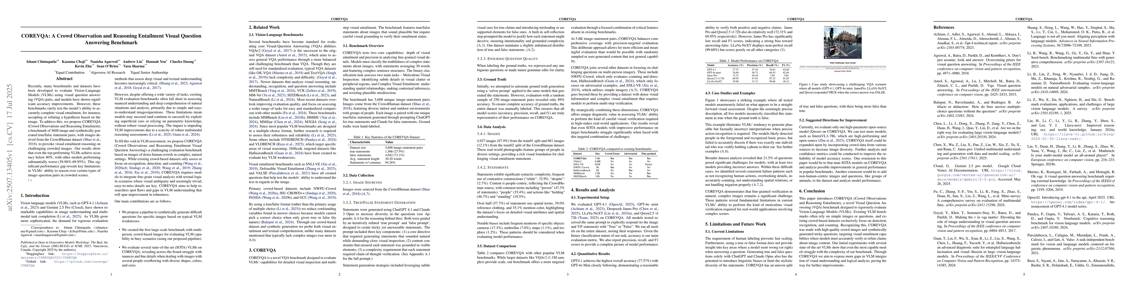 Recently, many benchmarks and datasets have been developed to evaluate Vision-Language Models (VLMs) using visual question answering (VQA) pairs, and models have shown significant accuracy improvements. However, these benchmarks rarely test the model's ability to accurately complete visual entailment, for instance, accepting or refuting a hypothesis based on the image. To address this, we propose COREVQA (Crowd Observations and Reasoning Entailment), a benchmark of 5608 image and synthetically generated true/false statement pairs, with images derived from the CrowdHuman dataset, to provoke visual entailment reasoning on challenging crowded images. Our results show that even the top-performing VLMs achieve accuracy below 80%, with other models performing substantially worse (39.98%-69.95%). This significant performance gap reveals key limitations in VLMs' ability to reason over certain types of image-question pairs in crowded scenes.