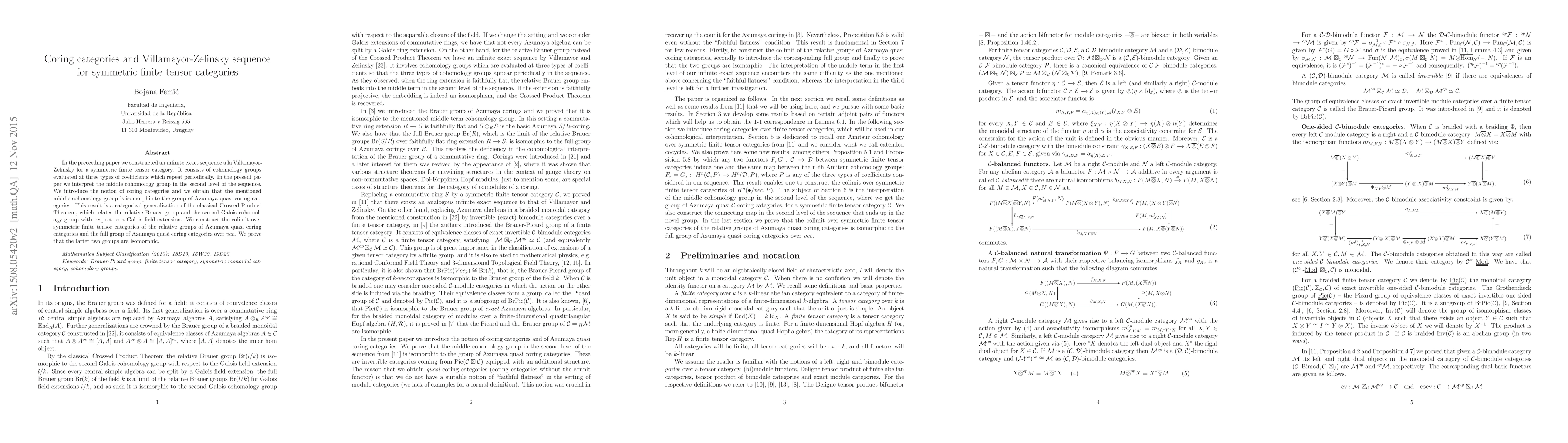 This paper interprets the middle cohomology group in a Villamayor-Zelinsky sequence for symmetric finite tensor categories, introducing the concept of coring categories. It demonstrates that this group is isomorphic to the group of Azumaya quasi coring categories, generalizing the classical Crossed Product Theorem.