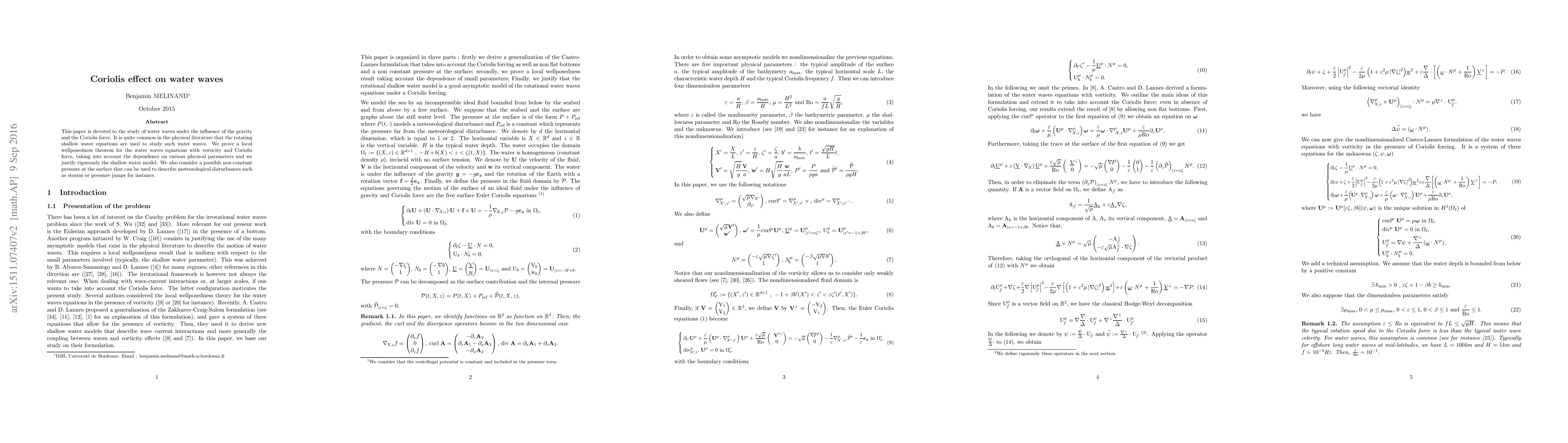 Researchers study the Coriolis effect on water waves, proving a local wellposedness theorem for equations that include vorticity and gravity, and justify the shallow water model, which can be used to describe meteorological disturbances.