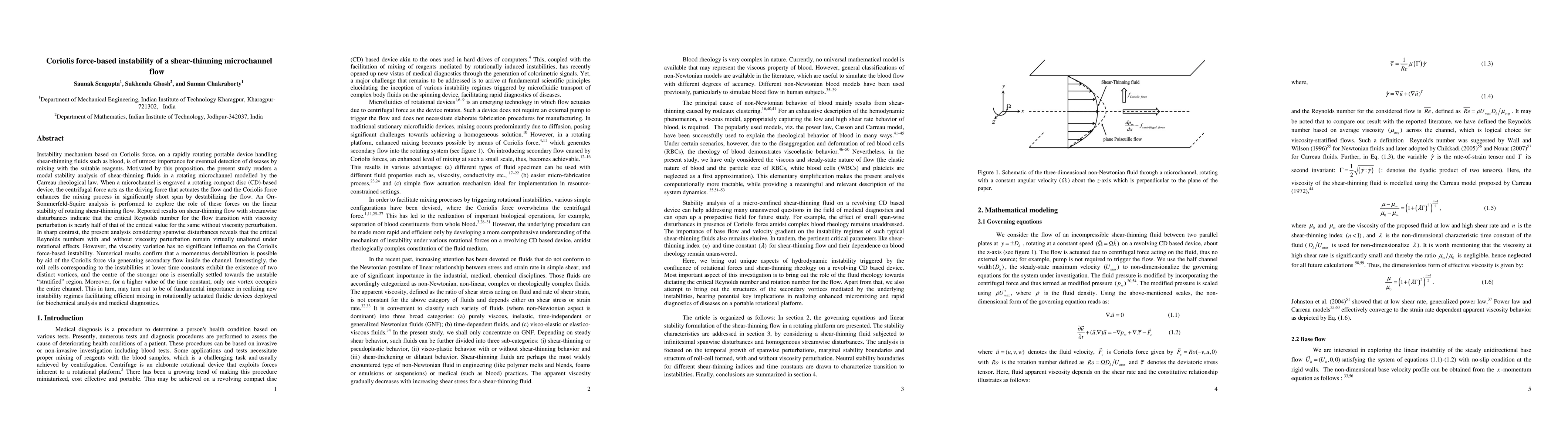 Instability mechanism based on Coriolis force, on a rapidly rotating portable device handling shear thinning fluids such as blood, is of utmost importance for eventual detection of diseases by mixing with the suitable reagents. Motivated by this proposition, the present study renders a modal stability analysis of shear thinning fluids in a rotating microchannel modelled by the Carreau rheological law. When a microchannel is engraved a rotating compact disc (CD) based device, the centrifugal force acts as the driving force that actuates the flow and the Coriolis force enhances the mixing process in significantly short span by destabilizing the flow. An OrrSommerfeld-Squire analysis is performed to explore the role of these forces on the linear stability of rotating shear-thinning flow. Reported results on shear thinning flow with streamwise disturbances indicate that the critical Reynolds number for the flow transition with viscosity perturbation is nearly half of that of the critical value for the same without viscosity perturbation. In sharp contrast, the present analysis considering spanwise disturbances reveals that the critical Reynolds numbers with and without viscosity perturbation remain virtually unaltered under rotational effects. However, the viscosity variation has no significant influence on the Coriolis force-based instability. Numerical results confirm that a momentous destabilization is possible by aid of the Coriolis force via generating secondary flow inside the channel. Interestingly, the roll cells corresponding to the instabilities at lower time constants exhibit the existence of two distinct vortices, and the centre of the stronger one is essentially settled towards the unstable stratified region. Moreover, for a higher value of the time constant, only one vortex occupies the entire channel.