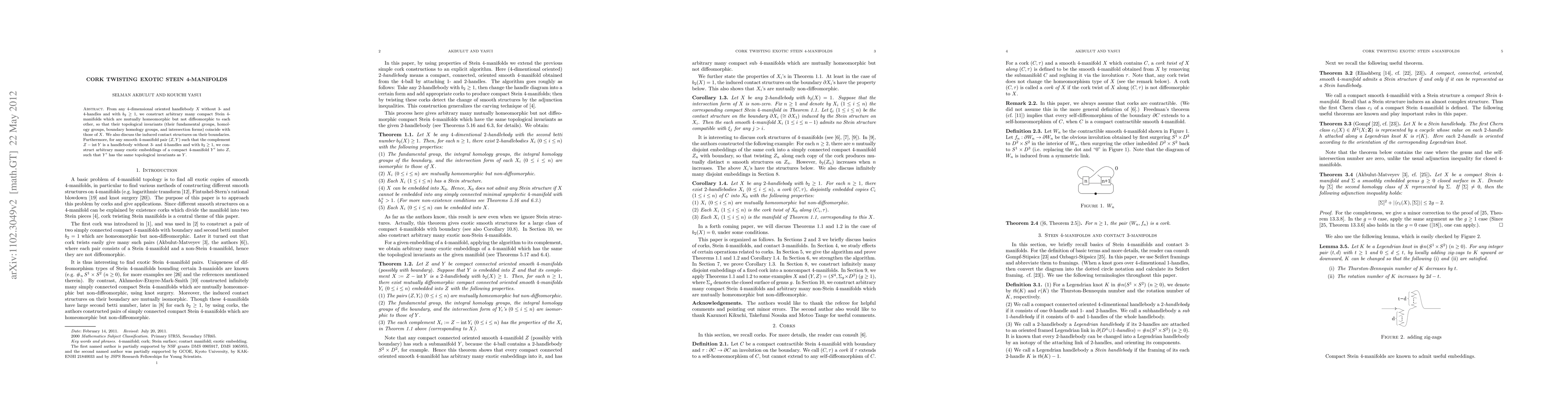This paper constructs numerous compact Stein 4-manifolds from a given 4-dimensional oriented handlebody X, showing they are homeomorphic but not diffeomorphic, while sharing X's topological invariants. It also explores the induced contact structures on their boundaries and presents exotic embeddings of compact 4-manifolds into a handlebody complement.