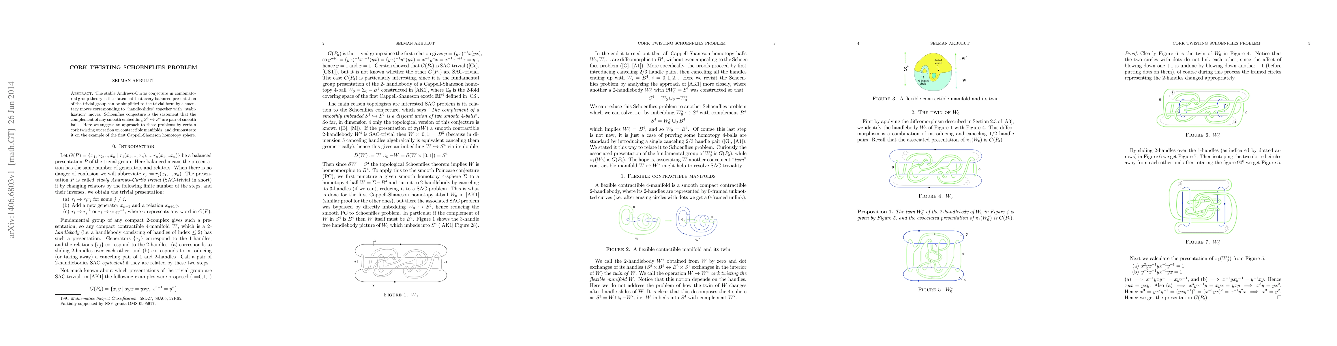 The stable Andrews-Curtis conjecture in combinatorial group theory is the statement that every balanced presentation of the trivial group can be simplified to the trivial form by elementary moves corresponding to "handle-slides" together with "stabilization" moves. Schoenflies conjecture is the statement that the complement of any smooth embedding S^3 into S^4 are pair of smooth balls. Here we suggest an approach to these problems by certain cork twisting operation on contractible manifolds, and demonstrate it on the example of the first Cappell-Shaneson homotopy sphere.