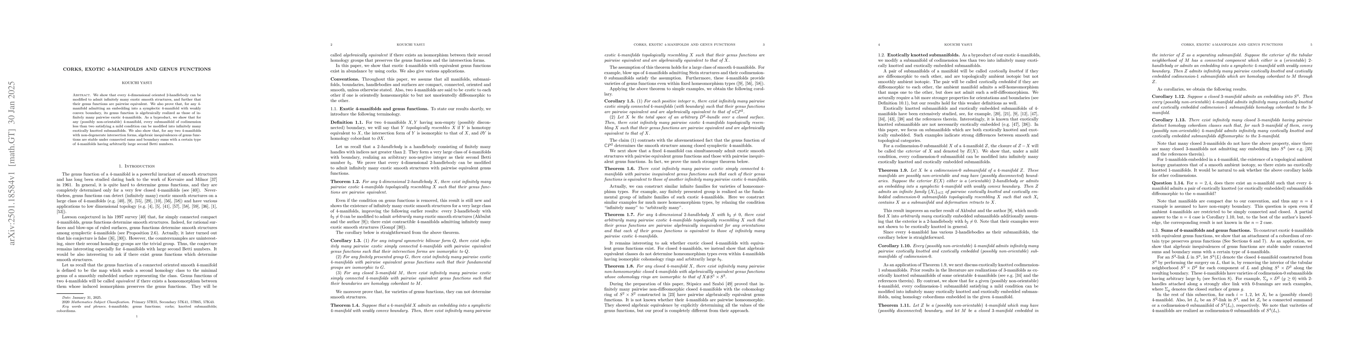 The work extends previous results on exotic 4-manifolds by demonstrating that infinitely many exotic smooth structures can be realized through controlled modifications, with a focus on the algebraic properties of genus functions, which introduces new insights into the topological classification of 4-manifolds.