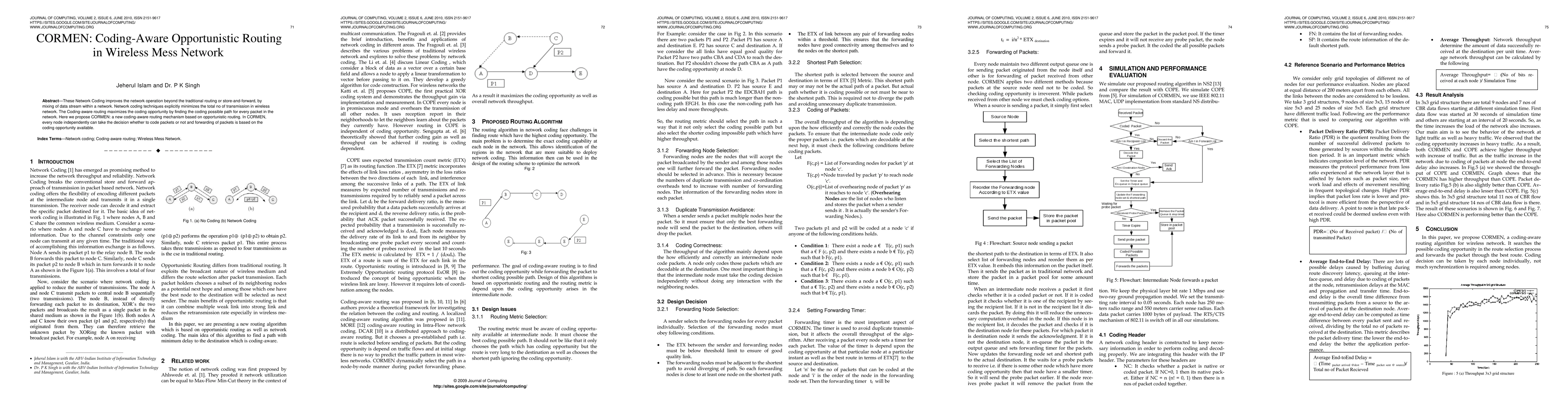 Title: CORMEN: Coding-Aware Opportunistic Routing in Wireless Mesh Network Summary: This paper proposes CORMEN, a novel coding-aware routing mechanism that leverages opportunistic routing to maximize network coding opportunities, thereby minimizing the total number of transmissions and improving network efficiency in wireless mesh networks.