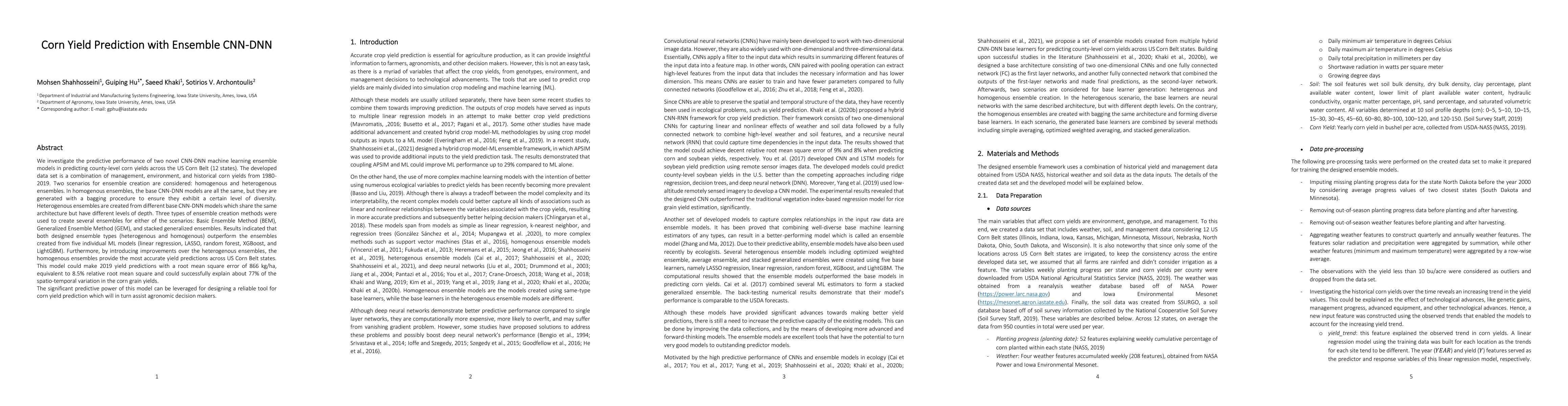 This paper evaluates the predictive performance of CNN-DNN ensemble models for county-level corn yield predictions across the US Corn Belt. Both homogenous and heterogeneous ensembles outperform individual machine learning models, with homogenous ensembles providing the most accurate predictions, explaining about 77% of the yield variation.