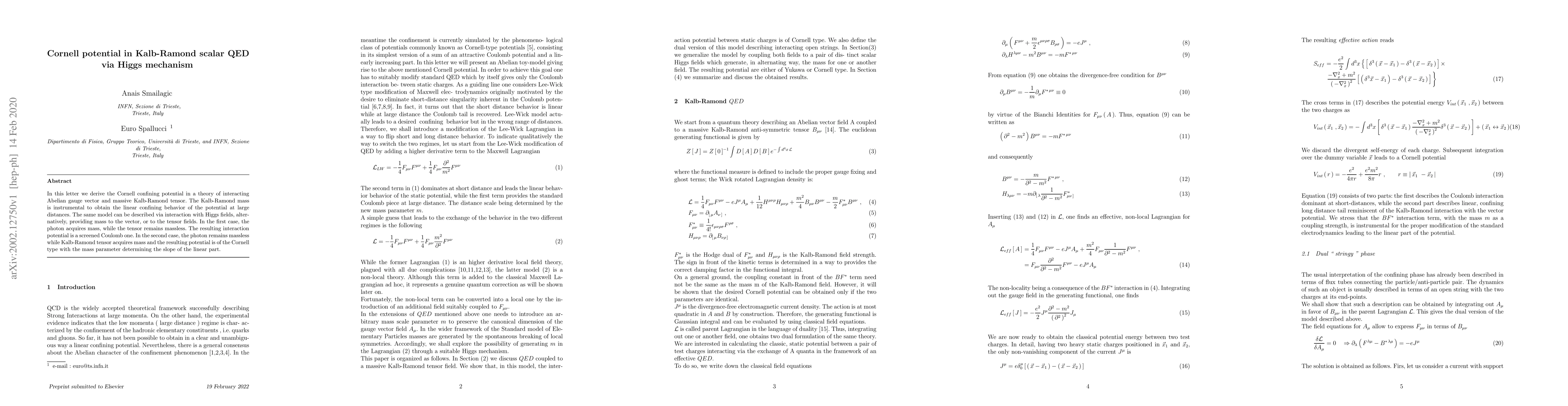 This paper derives the Cornell confining potential in a Kalb-Ramond scalar QED model, where the Kalb-Ramond mass induces linear confinement at large distances. The model can also be described via Higgs mechanism interactions, either giving mass to the photon or the Kalb-Ramond tensor, resulting in different types of interaction potentials.