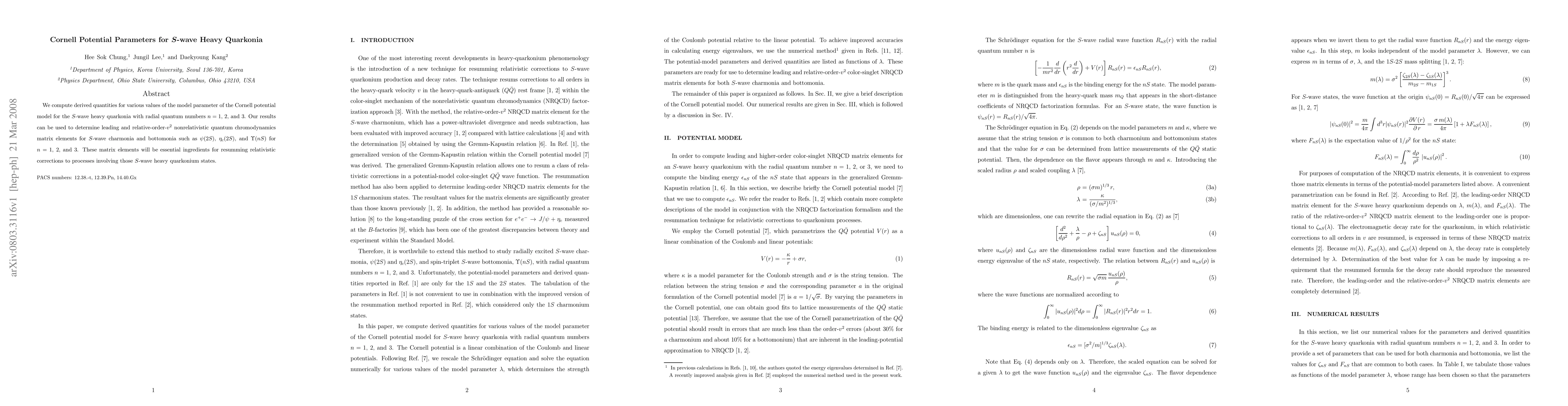 We compute derived quantities for various values of the model parameter of the Cornell potential model for the S-wave heavy quarkonia with radial quantum numbers n=1, 2, and 3. Our results can be used to determine leading and relative-order-v^2 nonrelativistic quantum chromodynamics matrix elements for S-wave charmonia and bottomonia such as psi(2S), eta_c(2S), and Upsilon(nS) for n=1, 2, and 3. These matrix elements will be essential ingredients for resumming relativistic corrections to processes involving those S-wave heavy quarkonium states.