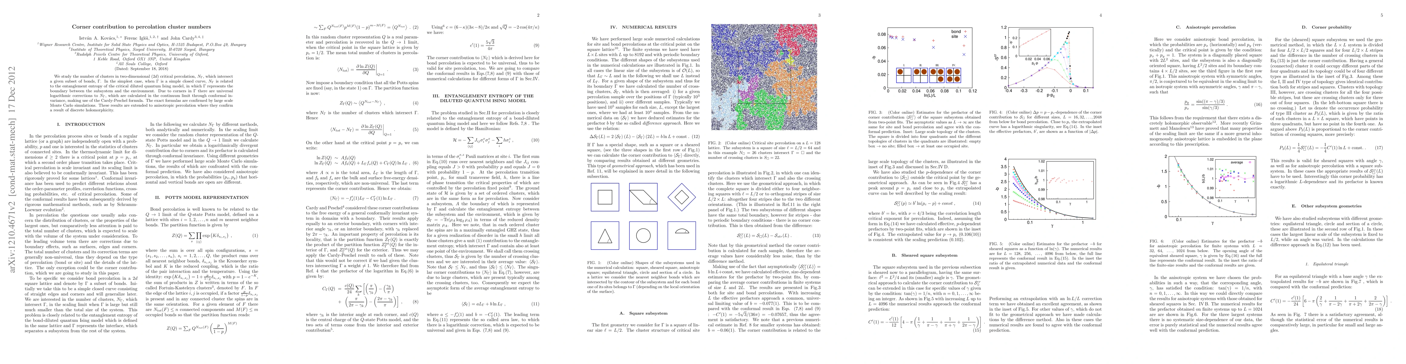 We study the number of clusters in two-dimensional (2d) critical percolation, N_Gamma, which intersect a given subset of bonds, Gamma. In the simplest case, when Gamma is a simple closed curve, N_Gamma is related to the entanglement entropy of the critical diluted quantum Ising model, in which Gamma represents the boundary between the subsystem and the environment. Due to corners in Gamma there are universal logarithmic corrections to N_Gamma, which are calculated in the continuum limit through conformal invariance, making use of the Cardy-Peschel formula. The exact formulas are confirmed by large scale Monte Carlo simulations. These results are extended to anisotropic percolation where they confirm a result of discrete holomorphicity.