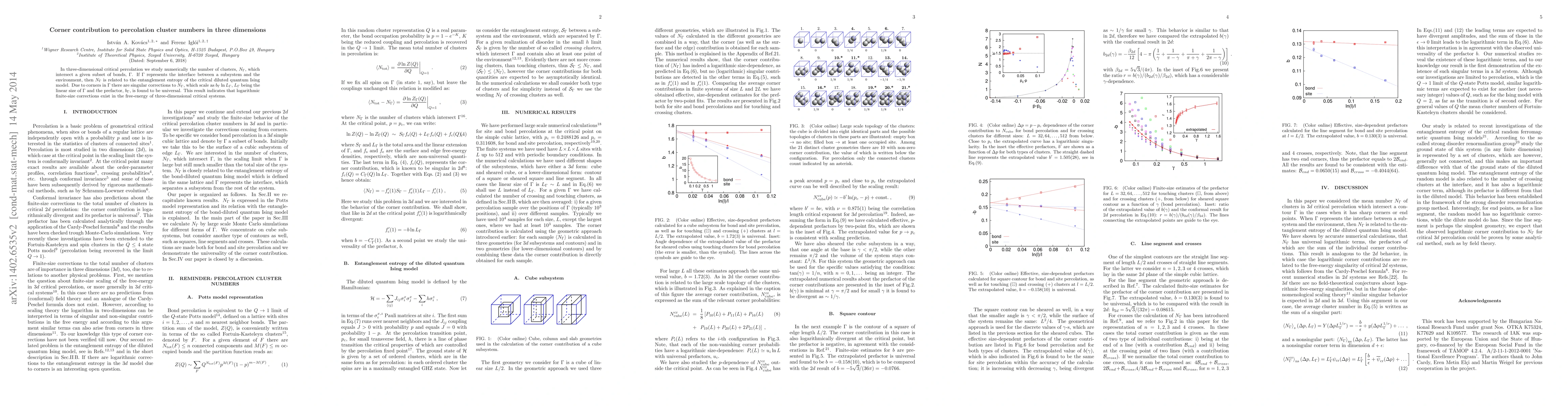 In three-dimensional critical percolation we study numerically the number of clusters, $N_{\Gamma}$, which intersect a given subset of bonds, $\Gamma$. If $\Gamma$ represents the interface between a subsystem and the environment, then $N_{\Gamma}$ is related to the entanglement entropy of the critical diluted quantum Ising model. Due to corners in $\Gamma$ there are singular corrections to $N_{\Gamma}$, which scale as $b_{\Gamma} \ln L_{\Gamma}$, $L_{\Gamma}$ being the linear size of $\Gamma$ and the prefactor, $b_{\Gamma}$, is found to be universal. This result indicates that logarithmic finite-size corrections exist in the free-energy of three-dimensional critical systems.