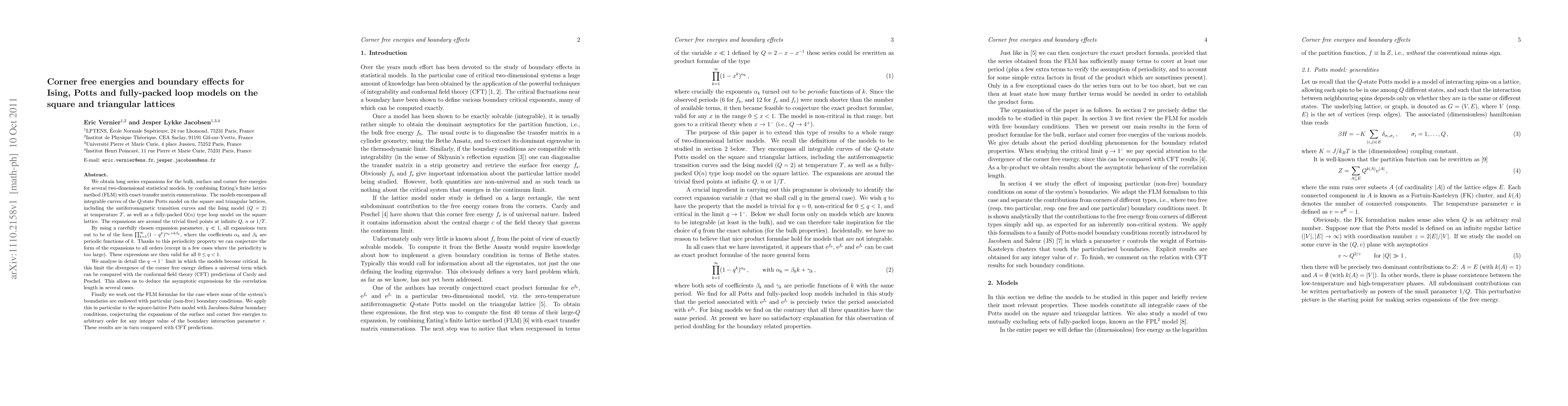 We obtain long series expansions for the bulk, surface and corner free energies for several two-dimensional statistical models, by combining Enting's finite lattice method (FLM) with exact transfer matrix enumerations. The models encompass all integrable curves of the Q-state Potts model on the square and triangular lattices, including the antiferromagnetic transition curves and the Ising model (Q=2) at temperature T, as well as a fully-packed O(n) type loop model on the square lattice. The expansions are around the trivial fixed points at infinite Q, n or 1/T. By using a carefully chosen expansion parameter, q << 1, all expansions turn out to be of the form \prod_{k=1}^\infty (1-q^k)^{\alpha_k + k \beta_k}, where the coefficients \alpha_k and \beta_k are periodic functions of k. Thanks to this periodicity property we can conjecture the form of the expansions to all orders (except in a few cases where the periodicity is too large). These expressions are then valid for all 0 <= q < 1. We analyse in detail the q \to 1^- limit in which the models become critical. In this limit the divergence of the corner free energy defines a universal term which can be compared with the conformal field theory (CFT) predictions of Cardy and Peschel. This allows us to deduce the asymptotic expressions for the correlation length in several cases. Finally we work out the FLM formulae for the case where some of the system's boundaries are endowed with particular (non-free) boundary conditions. We apply this in particular to the square-lattice Potts model with Jacobsen-Saleur boundary conditions, conjecturing the expansions of the surface and corner free energies to arbitrary order for any integer value of the boundary interaction parameter r. These results are in turn compared with CFT predictions.