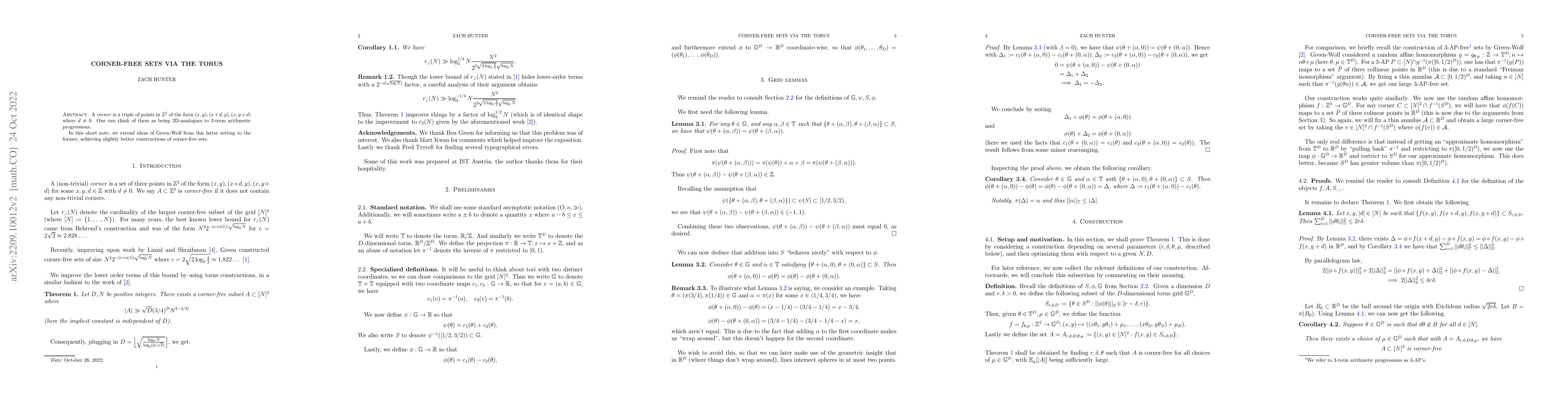 This paper extends the Green-Wolf method for constructing sets without 3-term arithmetic progressions to create corner-free sets in $\Bbb{Z}^2$, improving upon previous constructions of such sets.