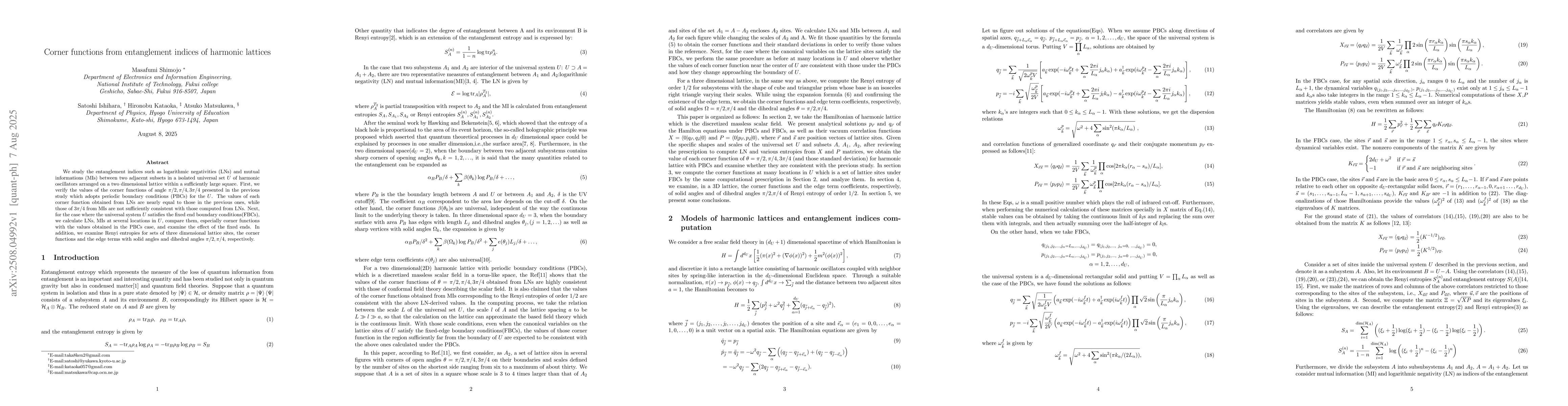 We study the entanglement indices such as logarithmic negativities (LNs) and mutual informations (MIs) between two adjacent subsets in a isolated universal set $U$ of harmonic oscillators arranged on a two dimensional lattice within a sufficiently large square. First, we verify the values of the corner functions of angle $\pi/2, \pi/4, 3\pi/4$ presented in the previous study which adopts periodic boundary conditions (PBCs) for the $U$. The values of each corner function obtained from LNs are nearly equal to those in the previous ones, while those of $3\pi/4$ from MIs are not sufficiently consistent with those computed from LNs. Next, for the case where the universal system $U$ satisfies the fixed end boundary conditions(FBCs), we calculate LNs, MIs at several locations in $U$, compare them, especially corner functions with the values obtained in the PBCs case, and examine the effect of the fixed ends. In addition, we examine Renyi entropies for sets of three dimensional lattice sites, the corner functions and the edge terms with solid angles and dihedral angles $\pi/2,\pi/4$, respectively.