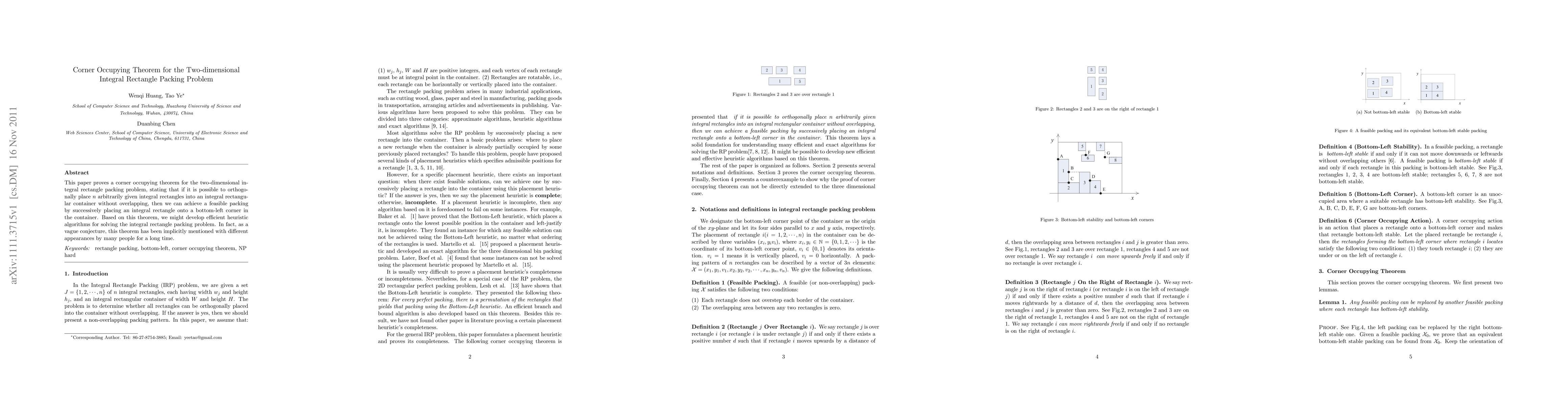 This paper establishes a corner occupying theorem for packing n integral rectangles into an integral container without overlap, suggesting efficient packing by placing rectangles in the bottom-left corner. The theorem supports the development of heuristic algorithms for solving the integral rectangle packing problem.