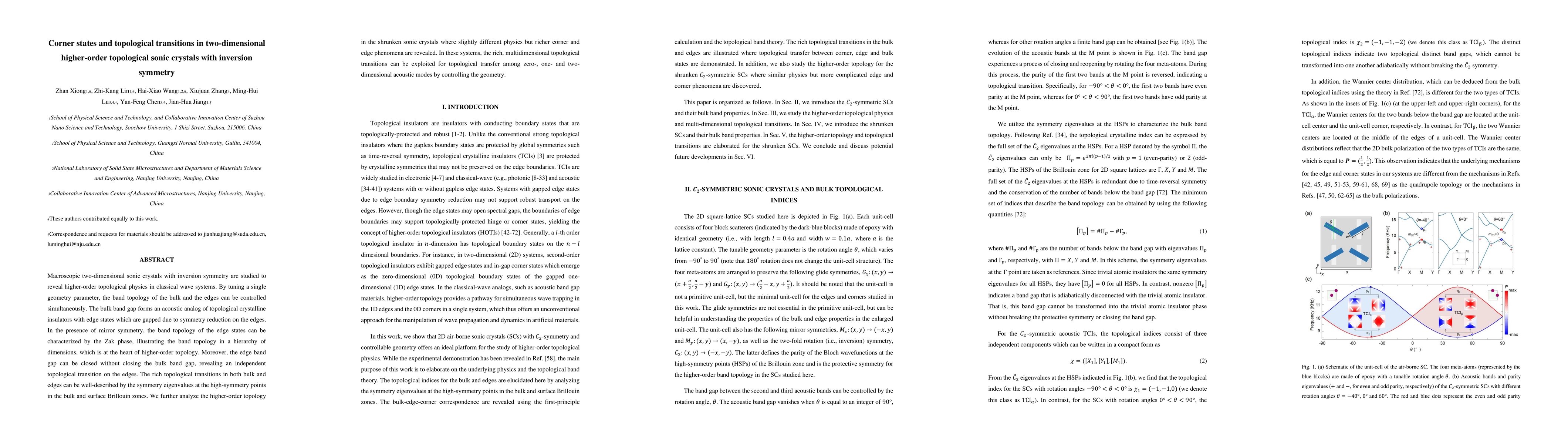 This paper investigates two-dimensional sonic crystals with inversion symmetry, demonstrating higher-order topological physics and tunable edge states through a geometry parameter. It reveals independent topological transitions in bulk and edge states, characterized by the Zak phase, and explores corner and edge phenomena in shrunken sonic crystals for potential topological transfer among acoustic modes.