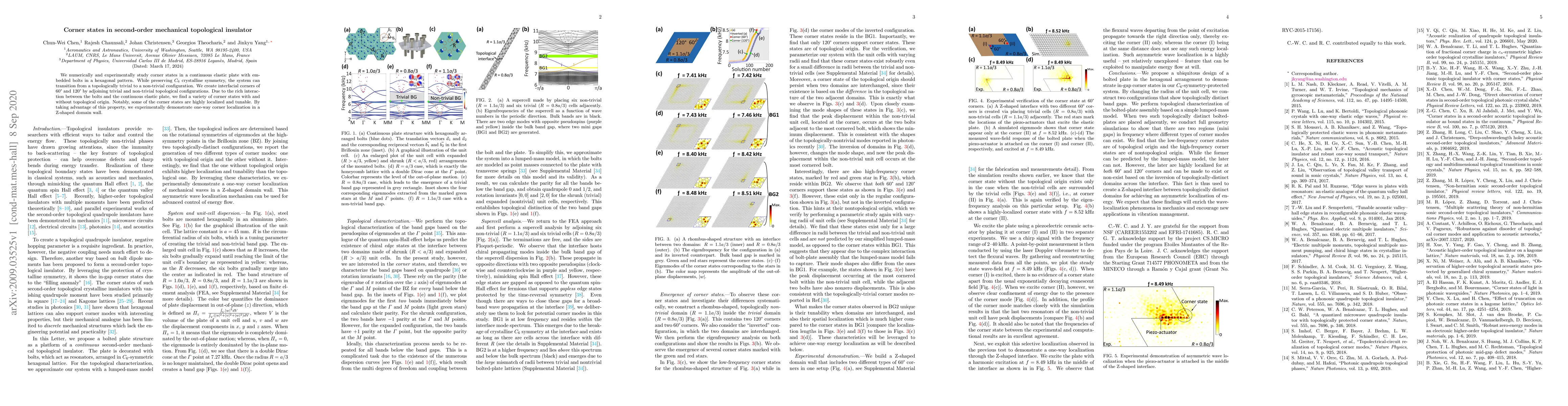 This paper investigates corner states in a second-order mechanical topological insulator by embedding bolts in a hexagonal pattern within an elastic plate. The study reveals tunable, highly localized corner states resulting from interactions between the bolts and the elastic medium, demonstrating one-way corner localization experimentally in a Z-shaped domain wall.