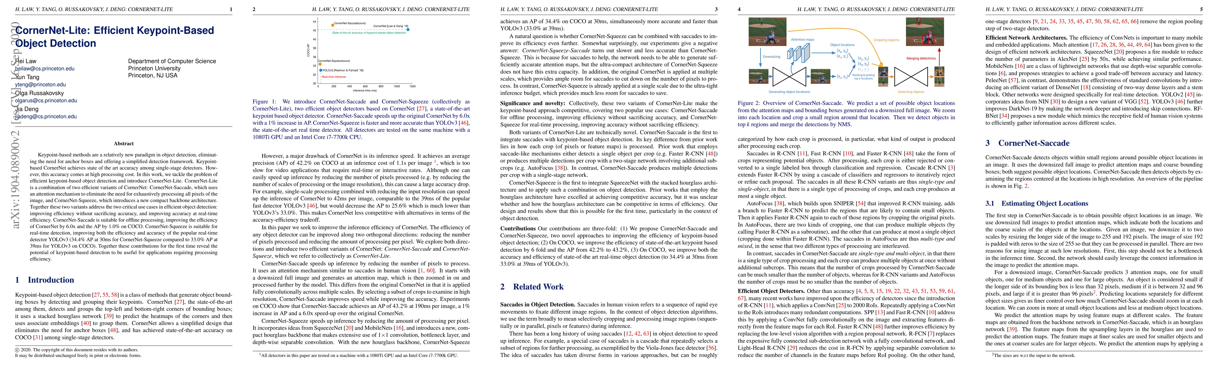 CornerNet-Lite introduces two efficient variants of CornerNet to enhance keypoint-based object detection: CornerNet-Saccade improves offline processing efficiency by 6.0x while maintaining 99% accuracy, and CornerNet-Squeeze boosts real-time detection efficiency, achieving 34.4% AP at 30ms compared to YOLOv3's 33.0% AP at 39ms.
