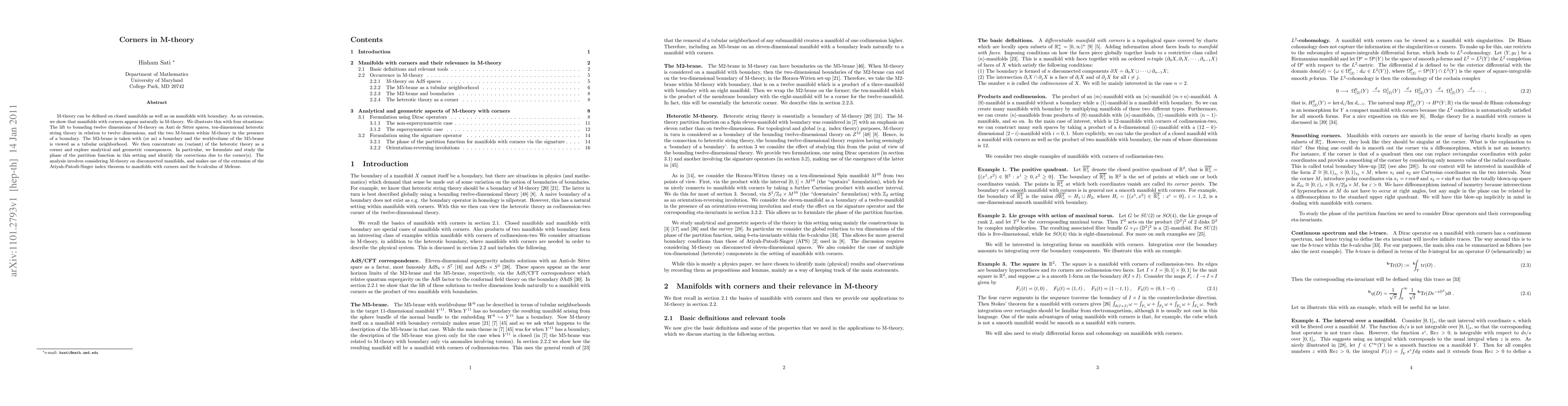 M-theory can be defined on closed manifolds as well as on manifolds with boundary. As an extension, we show that manifolds with corners appear naturally in M-theory. We illustrate this with four situations: The lift to bounding twelve dimensions of M-theory on Anti de Sitter spaces, ten-dimensional heterotic string theory in relation to twelve dimensions, and the two M-branes within M-theory in the presence of a boundary. The M2-brane is taken with (or as) a boundary and the worldvolume of the M5-brane is viewed as a tubular neighborhood. We then concentrate on (variant) of the heterotic theory as a corner and explore analytical and geometric consequences. In particular, we formulate and study the phase of the partition function in this setting and identify the corrections due to the corner(s). The analysis involves considering M-theory on disconnected manifolds, and makes use of the extension of the Atiyah-Patodi-Singer index theorem to manifolds with corners and the b-calculus of Melrose.
