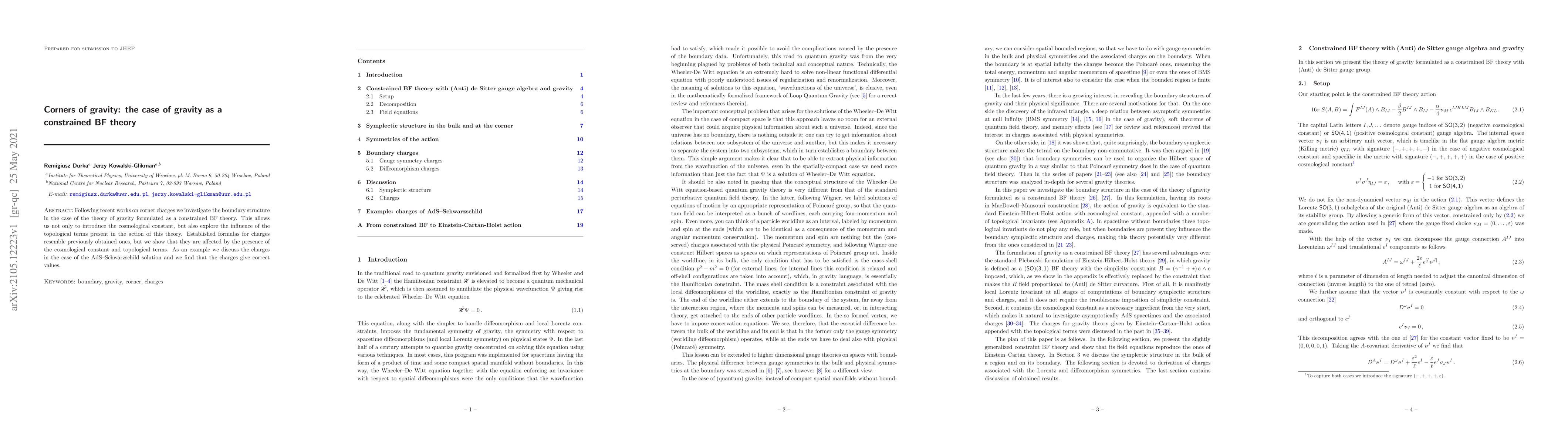 Following recent works on corner charges we investigate the boundary structure in the case of the theory of gravity formulated as a constrained BF theory. This allows us not only to introduce the cosmological constant, but also explore the influence of the topological terms present in the action of this theory. Established formulas for charges resemble previously obtained ones, but we show that they are affected by the presence of the cosmological constant and topological terms. As an example we discuss the charges in the case of the AdS--Schwarzschild solution and we find that the charges give correct values.