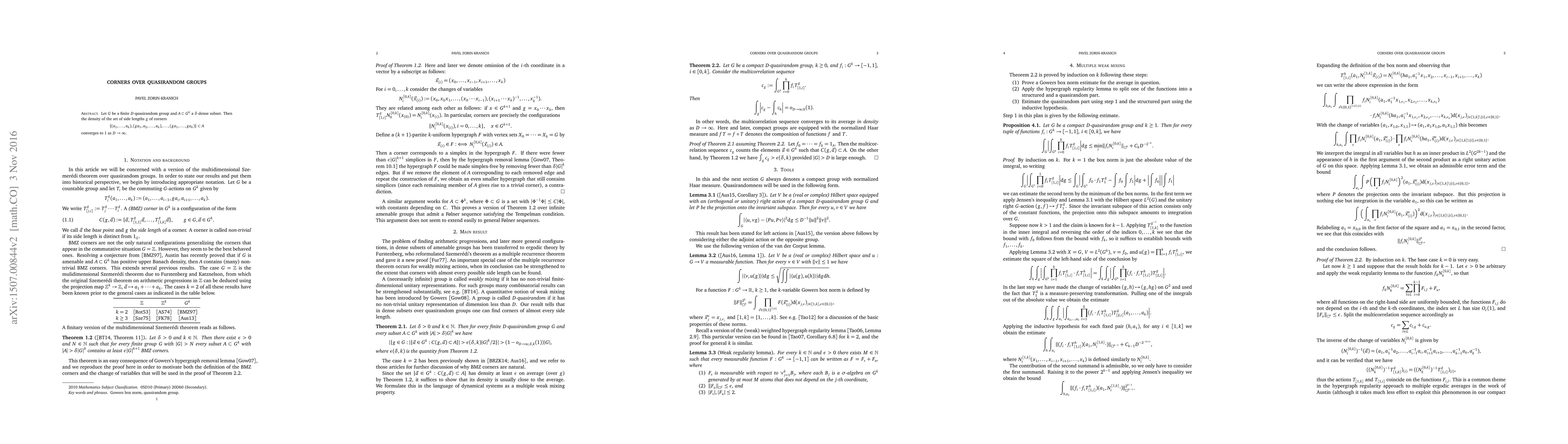 Let $G$ be a finite $D$-quasirandom group and $A \subset G^{k}$ a $\delta$-dense subset. Then the density of the set of side lengths $g$ of corners \[ \{(a_{1},\dots,a_{k}),(ga_{1},a_{2},\dots,a_{k}),\dots,(ga_{1},\dots,ga_{k})\} \subset A \] converges to $1$ as $D\to\infty$.