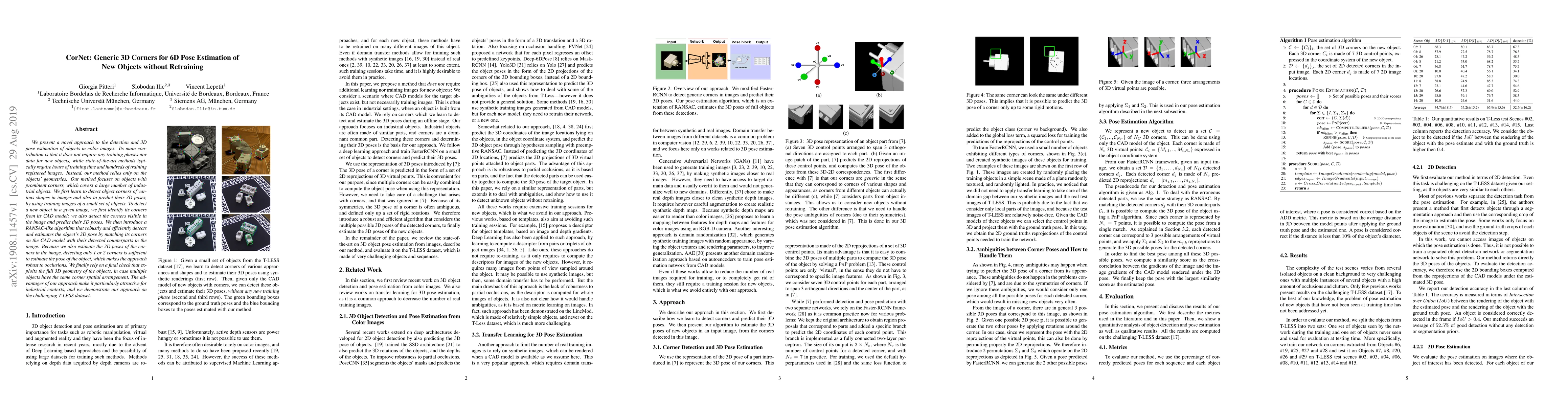 This research introduces CorNet, a method for detecting and estimating 3D poses of new objects in images without training. It uses object geometry, particularly corners, and a RANSAC-like algorithm for robust pose estimation. The method is effective for industrial objects and demonstrated on the T-LESS dataset, offering advantages in handling occlusions and multiple objects with similar corner arrangements.