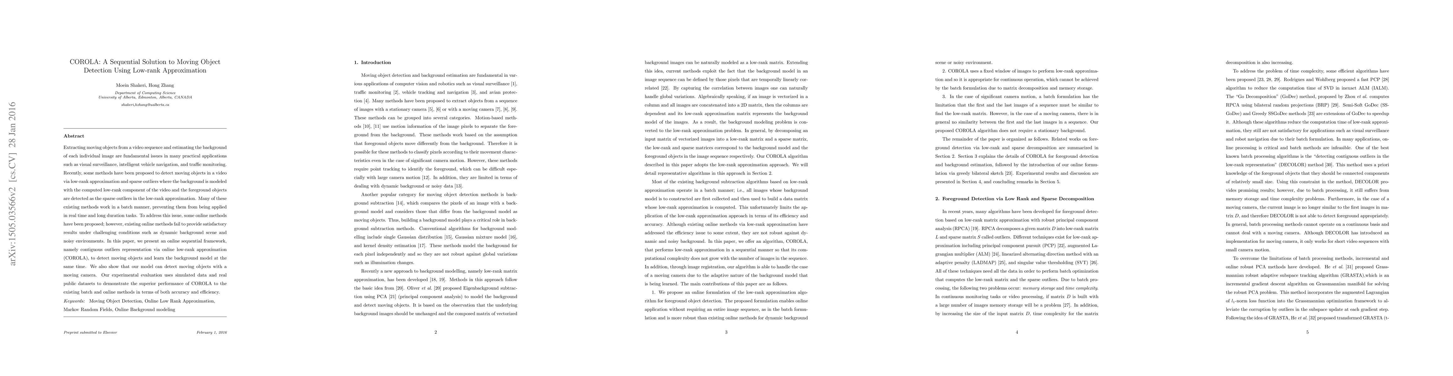 COROLA introduces an online sequential framework for real-time detection of moving objects using low-rank approximation, addressing limitations of batch methods. Experimental results show superior accuracy and faster execution compared to existing techniques.