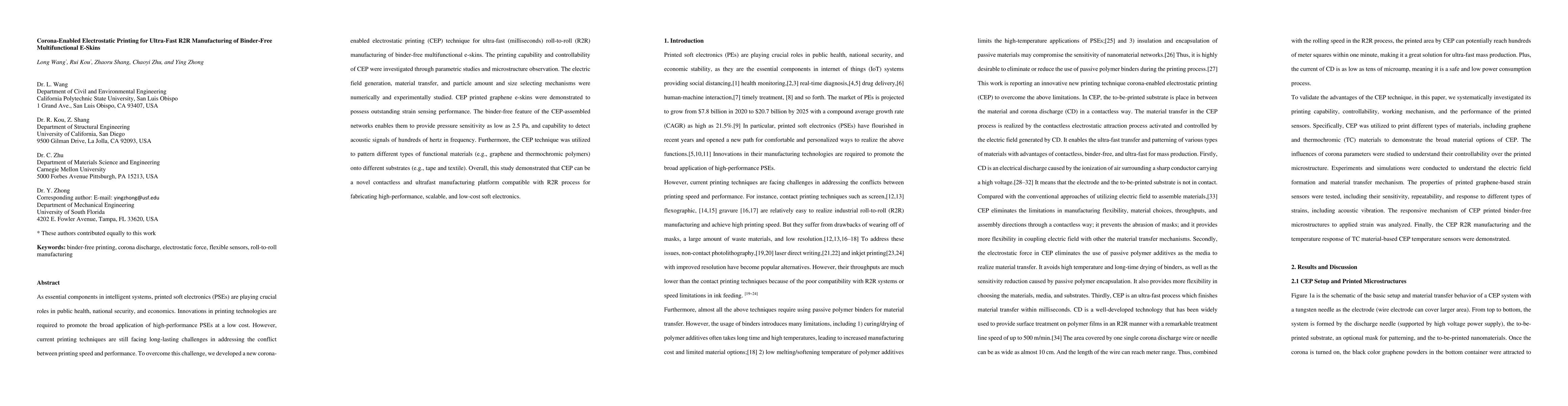 This paper introduces a novel corona-enabled electrostatic printing (CEP) technique for ultra-fast roll-to-roll manufacturing of binder-free multifunctional e-skins, achieving millisecond printing speeds while maintaining high performance. The CEP-printed graphene e-skins exhibit exceptional strain sensing and pressure sensitivity, making them suitable for scalable, low-cost soft electronics applications.